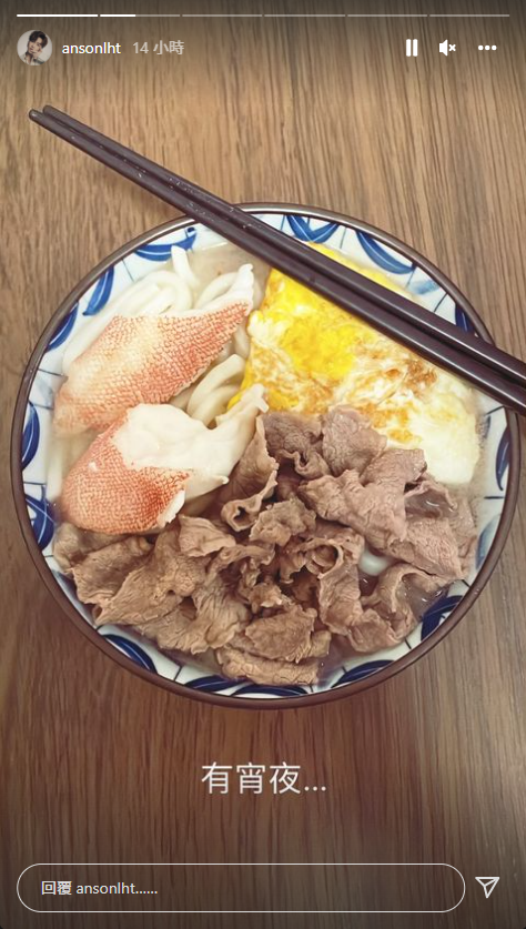 完成所有訪問回家後,Anson Lo在IG限時動態分享自己獲教母炮製愛心宵夜作為獎勵。他說︰「今晚冇特登叫教母留宵夜,然後啱啱沖完涼之後...」、「然後教母話:知你每次做show都一定全日唔會點食嘢,食碗烏冬當獎勵吓自己啦。」相中見到烏冬上有魚有薄切牛和煎蛋,份量十足。他除了公開向媽媽表達愛意,也向支持他的粉絲致謝︰「感謝每一位一直守候着、支持着嘅你。早啲休息啦-夜啦。聽日繼續如常要努力工作!Goodnight」