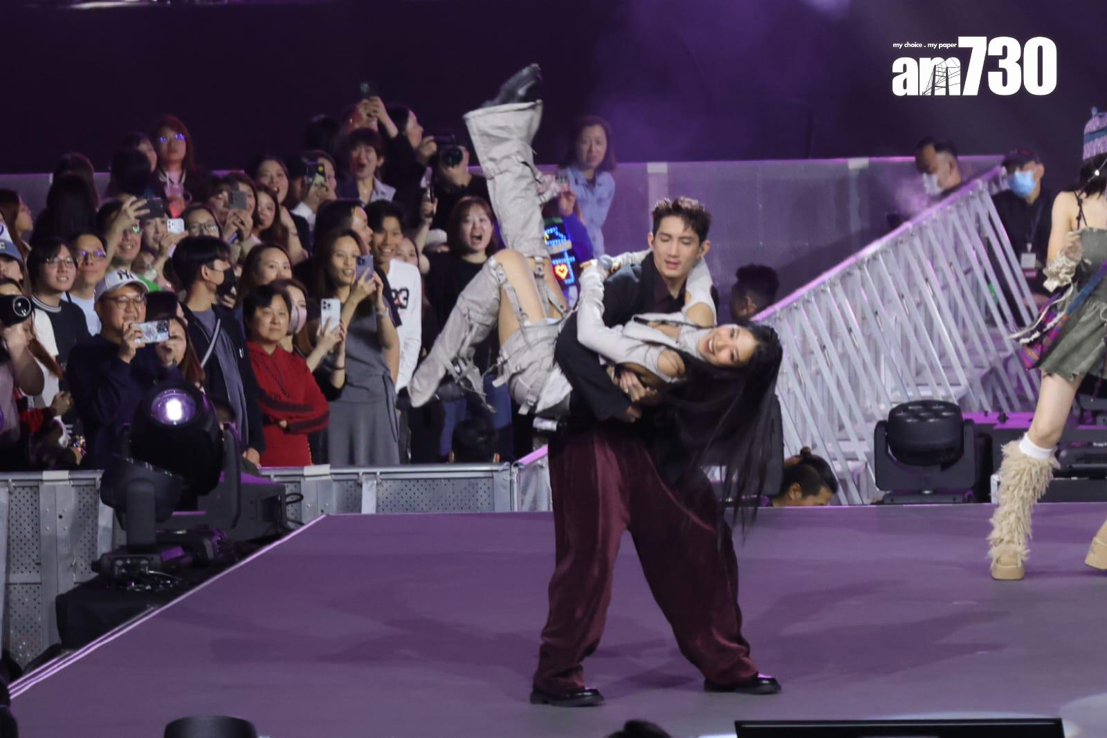 Kelly與MIRROR合唱幾句《失憶周末》,但MIRROR一眾成員都「唔入咪」。(娛樂組攝)