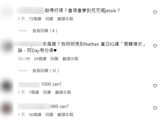 其後有網民列出時間線,質疑Day介入Nathan與圈外女友Jessie的關係。事件發酵多日,Day日前在TG粉絲群組回應︰「對不起讓喜歡我的大家擔心了,我會努力生活,專注工作,大家也要按時吃飯,繼續善良。」此外,她亦在IG貼上跟Gao及Candy的跳舞片段,當無事發生。