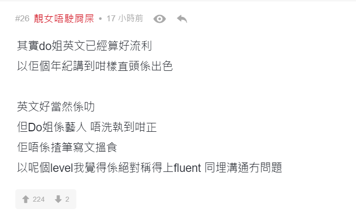 不過,也有人支持馬米高指出問題,令大家學到更多英文︰「唔係好關Do姐事。而係香港傳統英文教育就係咁」、「馬米高嘅重點應該係想講,Do姐嘅英文係可以應付到日常同外國人嘅普通交流,但如果要再深入啲,small talk嘅話,就未必應付到。」