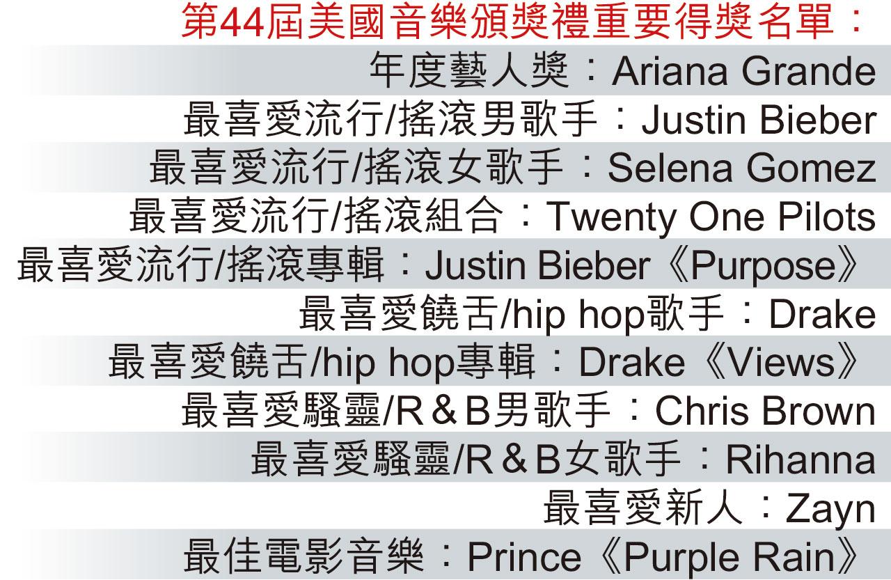 《第44屆美國音樂頒獎禮》(American Music Awards, AMA在當地時間周日(20日)於美國洛杉磯舉行,加拿大歌手Justin Bieber、加拿大饒舌歌手Drake,各得4獎成為大贏家,而Justin前度女友Selena Gomez歷經休養後復出,哽咽致謝「最受歡迎女歌手」殊榮。