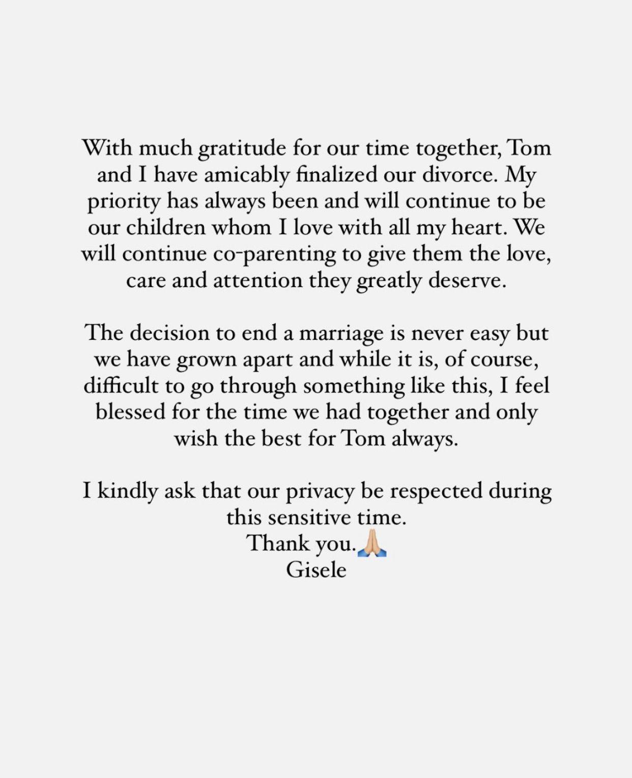 Gisele的婚姻近年一直出現問題,早前已爆出兩人已聘請律師辦離婚之消息,並打算分割數百萬美元財產,兩人以和平態度作出離婚決定。Gisele與Tom Brady各自發聲明承認已辦妥離婚手續,表示作出今次決定是相當困難及痛苦,並會祝福對方,Gisele還透露,兩人育有的一對子女,今後她仍會跟Tom Brady共同撫養兩個孩子。