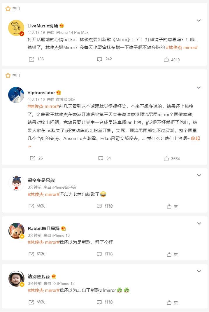 另外,JJ與MIRROR的事件亦引來大陸網民關注,更登上微博熱搜。當按入熱搜之後,見到不少網民表示以為JJ推出新歌叫《MIRROR》,亦有人討論JJ與MIRROR哪一個較紅,但因為大陸人對MIRROR的印象不多,因此他們也不停留言問︰「MIRROR是誰啊?」