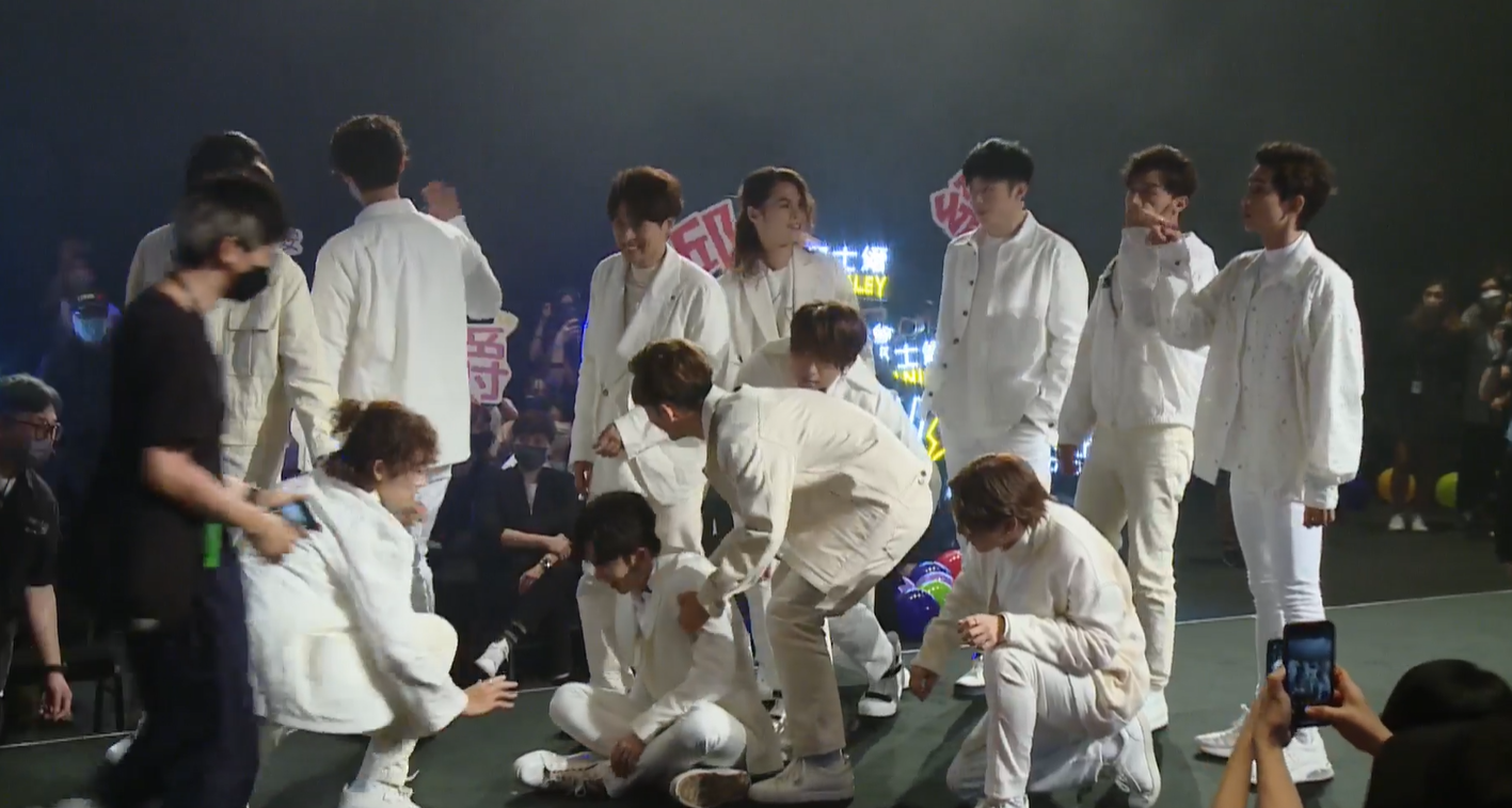 另外,12位鏡仔踎低拍照時,Anson Lo一度面露難色,期間更要搭住隊友的膊頭起身。然而,工作人員示意要留下轉往另一個角度時,Anson Lo再次蹲下時,也顯得十分辛苦。當一眾成員轉往另一位置拍照時,Anson Lo選擇坐在地上,身旁的Alton曾拍拍他的腳以示鼓勵。完成所有拍照後,Anson Lo就因為未能起身而要Edan扶起。當時網民在直播中頻頻留言表示很擔心Anson Lo的情況及關心姜濤的腳患。