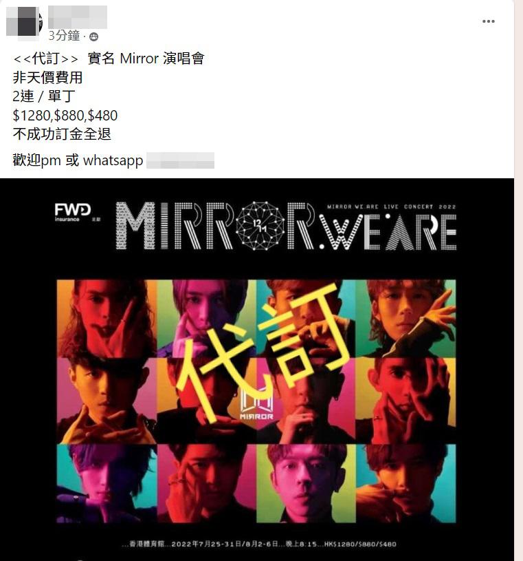 MIRROR演唱會門票掀起炒價,為了打擊黃牛黨,MIRROR門票推行實名制購票方式,每人每次只能購最多2張門票。由於今次實名制的門票只佔總票量的三成,而七成門票則經信用卡及內部訂購,兼不用實名制,因而令這批門票價格急升,更一度驚見460多萬一張,足夠買入一個平價單位。