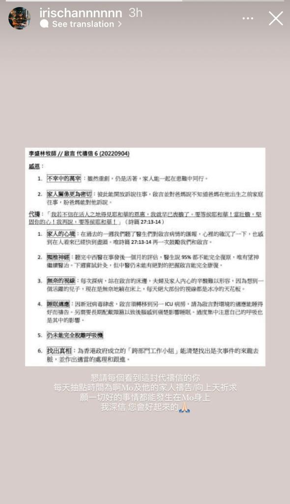 阿Mo的女友、COLLAR成員So Ching早前曾以「helpless」形容當前的情況,今日她再在IG限時動態轉發李盛林牧師的代禱信,並謂「當你真心渴望某件事,整個宇宙都會聯合起來,幫助你完成-Paulo Coelho.我相信係有神蹟的。」而與阿Mo合作無間的多位舞蹈員,亦有轉發代禱信,期待阿Mo早日歸隊。
