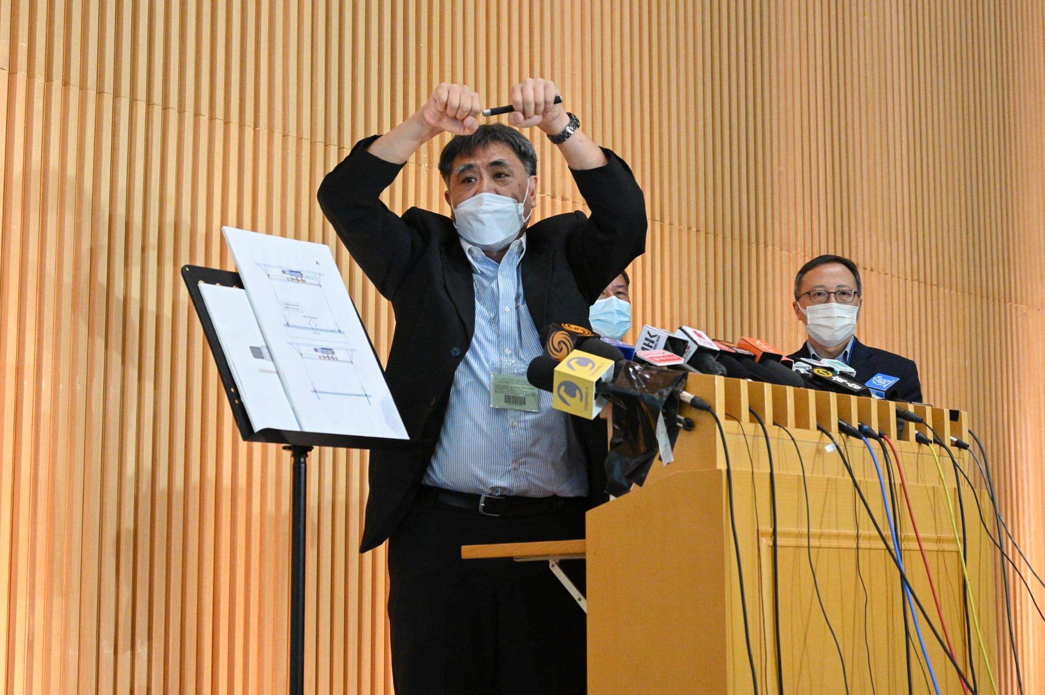 專家顧問林超雄指,發現斷裂的鋼絲承受力比一般鋼絲少20%。(李睿哲攝)