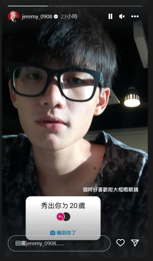 將於8月開騷的李駿傑(Jeremy)近日積極準備,今日他在社交平台上載一張自己廿歲時自拍照,戴住眼見的Jeremy跟現在的他大不同,看上去更有點似歌手洪助昇。Jeremy留言說︰「個時好喜歡咁大框嘅眼鏡。」