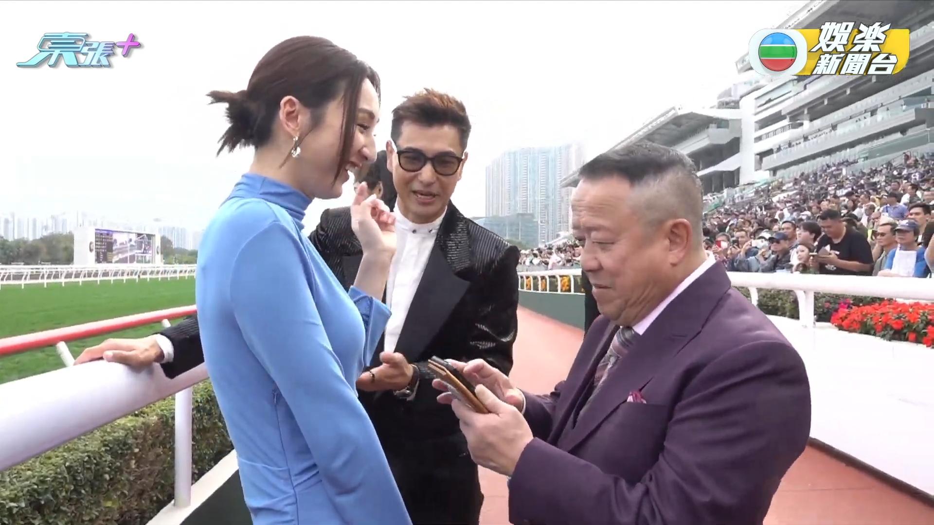 曾志偉在賽事開跑前,拿出手機幫高海寧、陳展鵬下注。(TVB娛樂新聞台直播截圖)