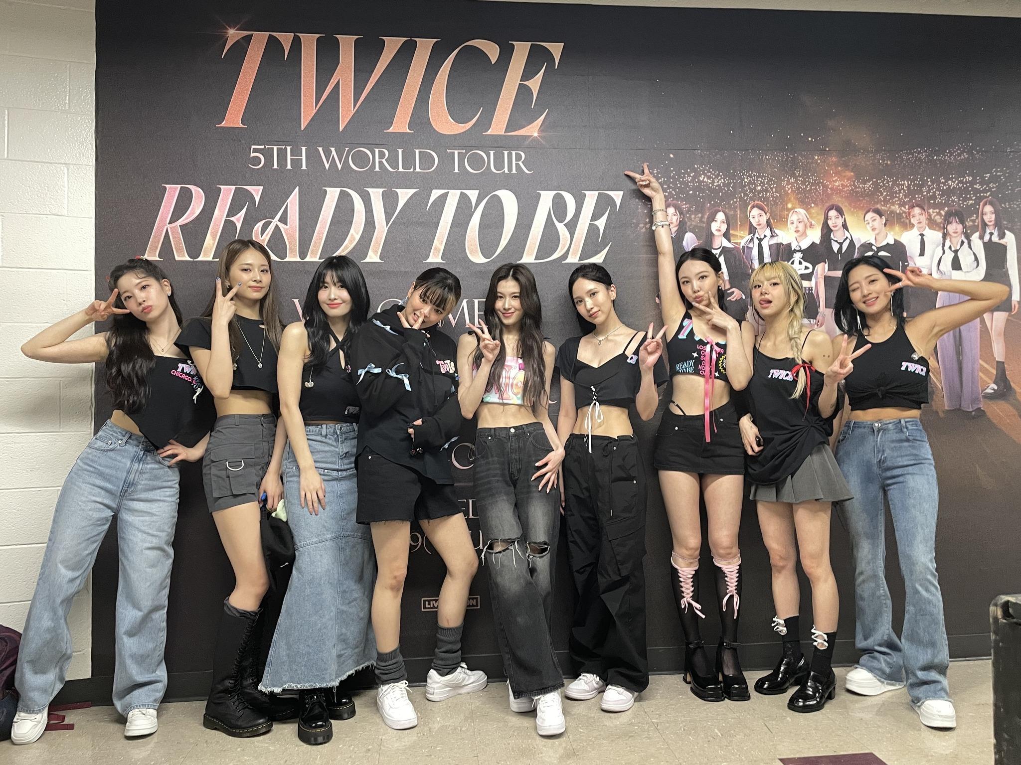 (左起)多賢、子瑜、MOMO、定延、Sana、Mina、娜璉、彩瑛、志效在後台合照留念,Sana明顯比其他人纖瘦。
