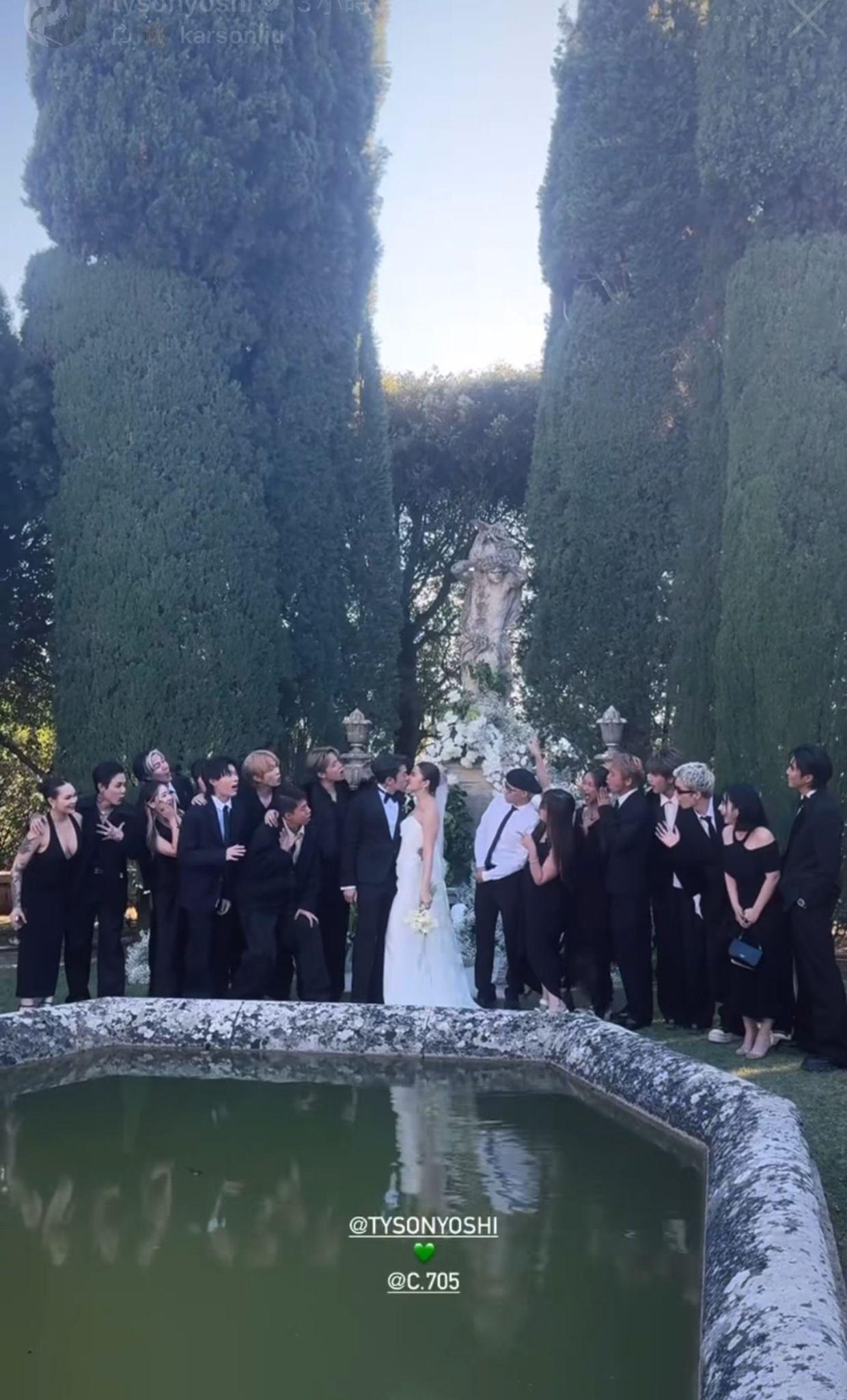 Tyson Yoshi的意大利婚禮會搞足三天,張敬軒、婁峻碩、焦凡凡、邱彥筒(Marf)、林家熙(Locker)、Serrini、Madboii、湯令山(Gareth. T)、魏浚笙(Jeffrey)等,當來到Day 2,一對新人穿上禮服及婚紗在一座古雅莊園行禮,不僅畫面非常夢幻,Christy與新郎哥不停啜嘴,惹來賓客們熱烈歡呼,閃爆全場。香港時間今日(10日)凌晨,Tyson 與Christy在莊園內行禮,`這天的dress code是黑色,大家也穿上一身黑色打扮,當行完禮之後,齊齊來個大合照,一對新人在婚宴上更被嘉賓高呼三年抱兩,Tyson Yoshi即答︰「盡力!」親口承諾會積極造人。