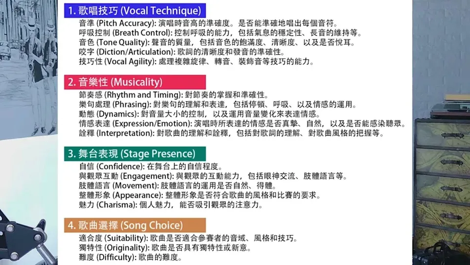 此外,張崇德又制定一套評分準則,表示從音準拍子、聲線氣息、技巧難度、感情投入及舞台表現呢五個角度去評價參賽者,可以將主觀因素減低,大家根據呢啲角度去畀分就可以做到一視同仁。
