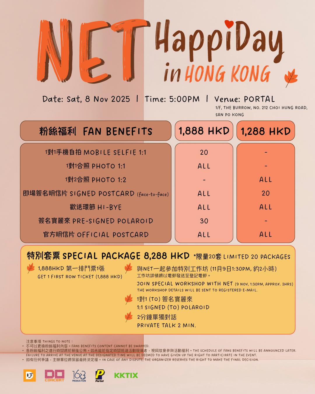 香港粉絲見面會定在11月8日(星期六)假新蒲崗PORTAL舉行,除了港幣$1,288及$1,888兩種票價外,官方宣布推出索價$8,288港元的限量20套VIP套票,購買此套票的HAPPINET(粉絲稱號),除享有$1,888門票的所有福利外,還能於11月9日跟Net一同參與兩小時的特別工作坊,體驗與偶像近距離共度美好時光的獨特機會。