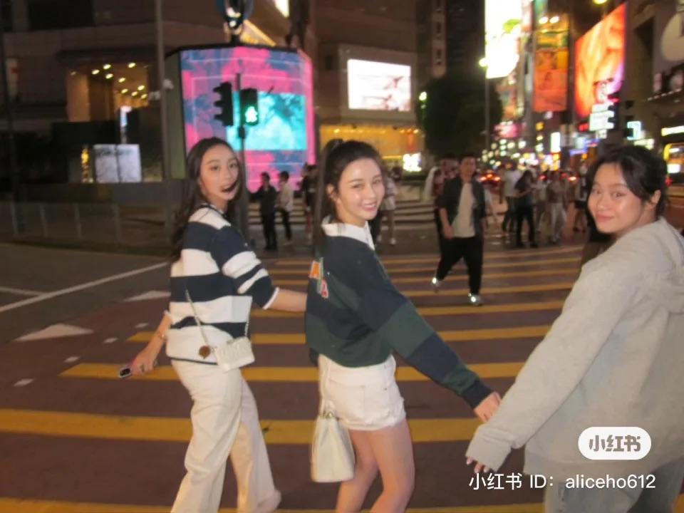 何超欣喺小紅書上載與沈月及劉秀樺行街食街頭小食嘅照片,並寫上:「跟姐妹們一起逛吃逛吃」,三位上流社會千金衣着打扮低調,同一般少女嘅打扮差唔多。