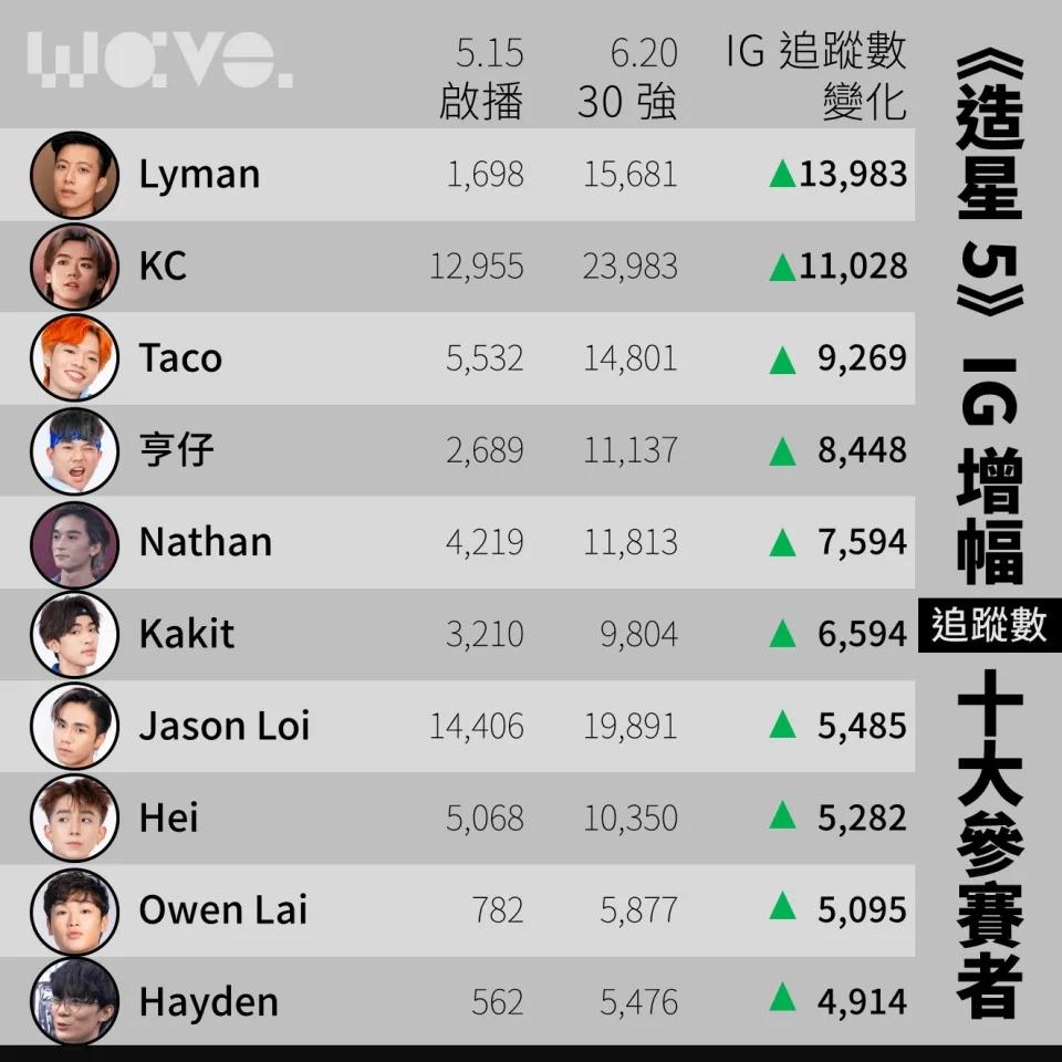 《全民造星 5》節目進入最後兩星期,比賽繼續進行,參賽者的表演以至各組勝負,不時成為網民茶餘飯後的話題。《Wave. 流行文化誌》把鏡頭拉遠一點,看看節目首播至今,哪些參賽者 IG 追蹤人數增長最快 — 換句話說,若以名氣為標準,誰從節目中斬獲最多?