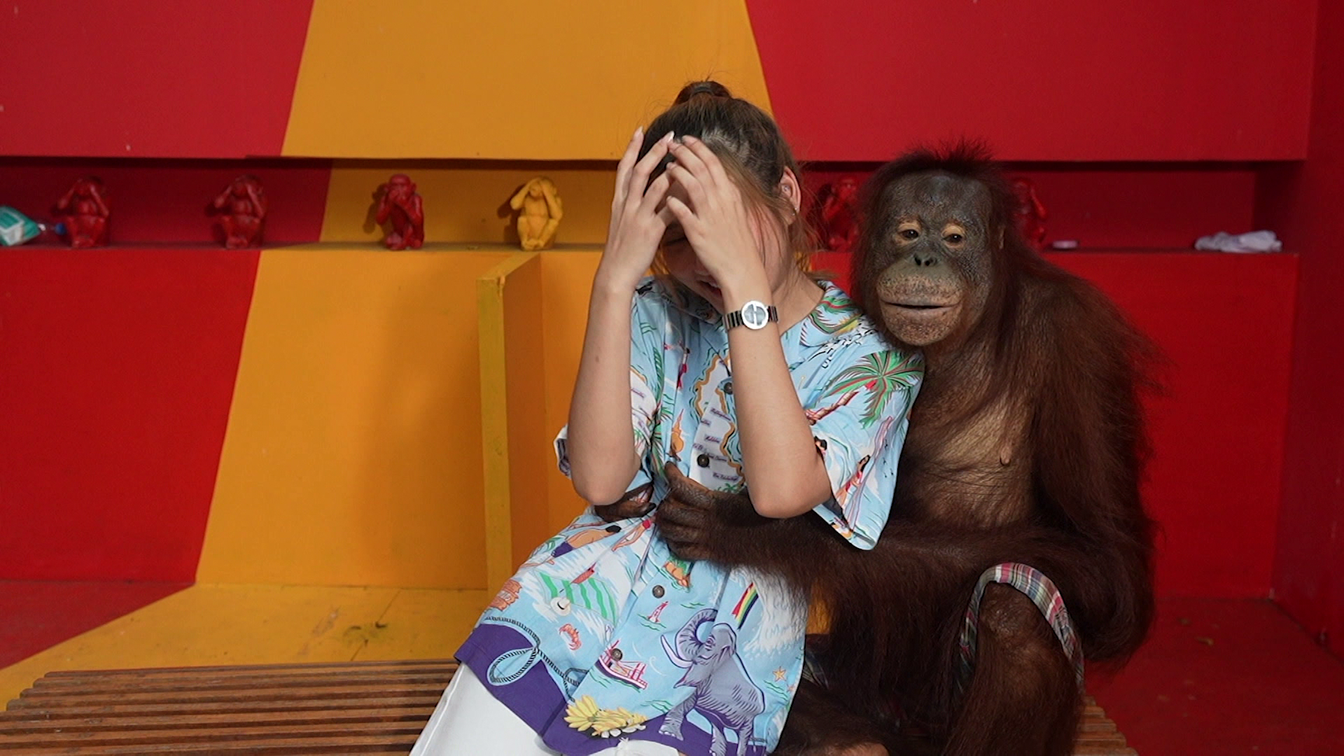 昨晚(15日)胡慧冲帶住冬蔭表妹同表哥,到訪曼谷超大型開放式動物園。冬蔭表妹玩得最開心,她坐鐵籠車餵飼老虎、又餵長頸鹿愛心爆棚。不過冬蔭表妹同園中猩猩合照時就「出事」,猩猩似乎垂涎美色,對她特別熱情一見面便狂錫。猩猩接住再轉姿勢,趟在冬蔭表妹大腿後再錫。最狼死一招是雙手環抱胸前,令冬蔭表妹有點不知所措,最後猩猩還得意地同冬蔭表妹伸脷合照。昨晚節目還介紹可以瞓住大床睇戲的戲院、全場服務員都是女扮男裝;以女仕為主打的高級酒吧。