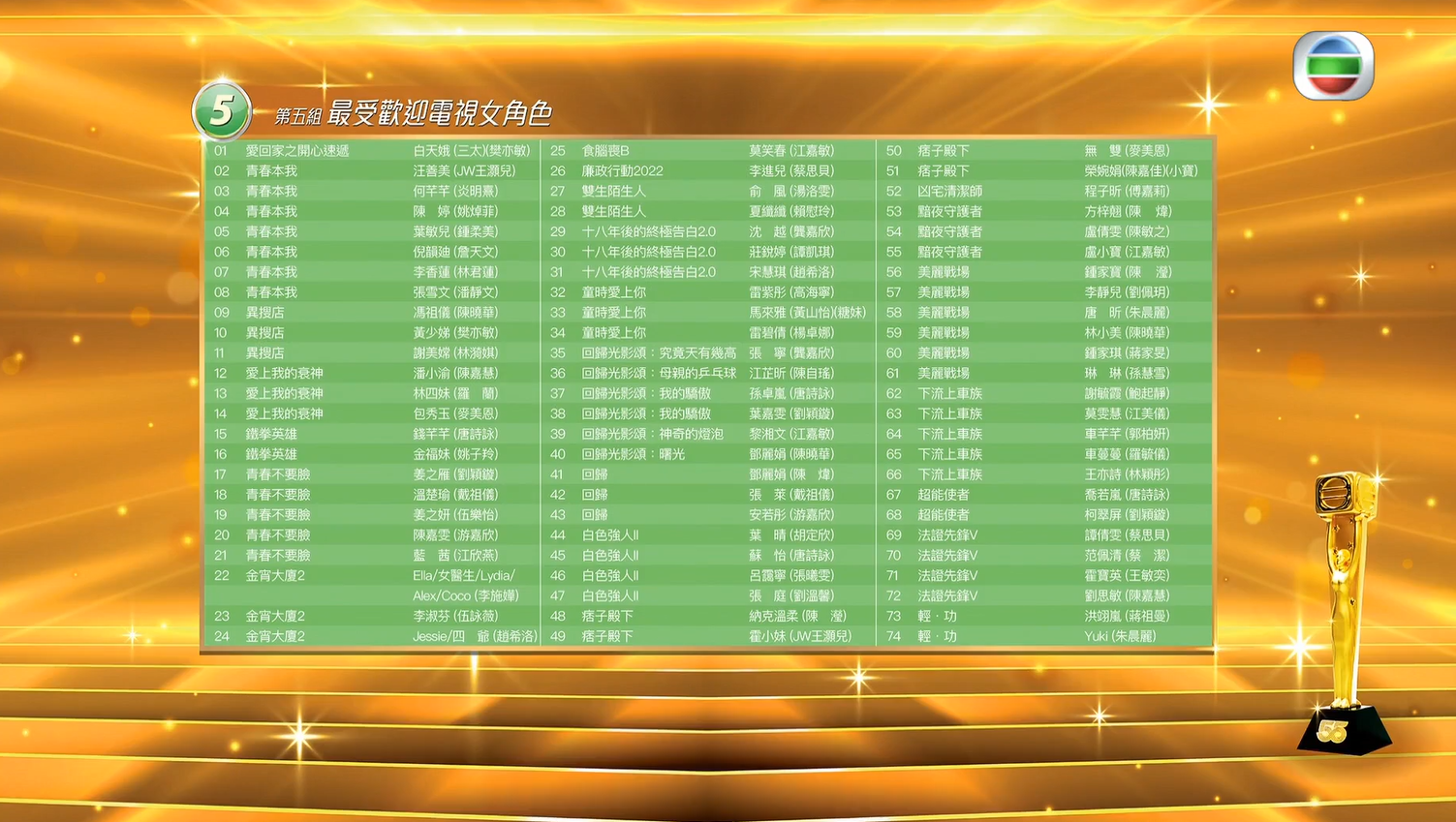視后方面,已離巢的唐詩詠分別憑住《鐵拳英雄》、《回歸光影頌:我的驕傲》、《白色強人II》及《超能使者》入圍,但過去無綫愛頒給親生女,變相陳煒、江美儀、陳曉華及陳瀅獲睇高一線,其中陳曉華共有3劇入圍。