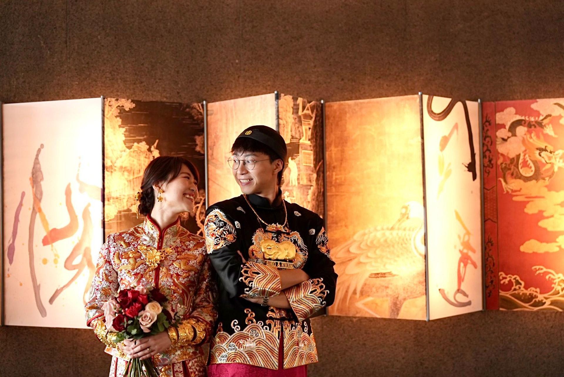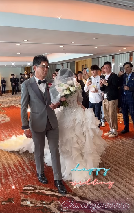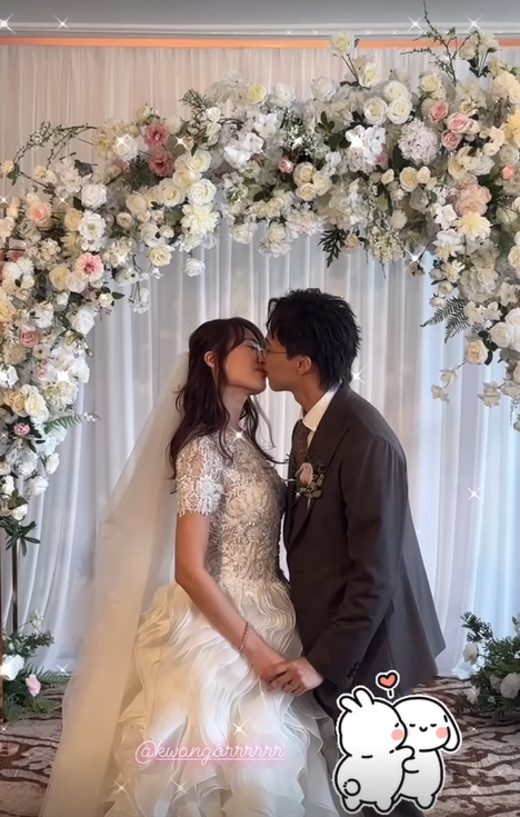 坤哥表示因為已經註冊,所以今次婚禮流程很簡單,亦有依足傳統向長輩敬茶。他透露媽媽感動到眼濕濕,而太太的父母昨晚才抵港,首次來港便是出席他們的婚禮。他稱今次場地有限,只邀請一百位親友,當中也有7、8位日本朋友,稍後會再跟其他朋友食飯慶祝。從大會發布的照片所見,愛子也有穿上中式裙褂,手上更戴滿金器。