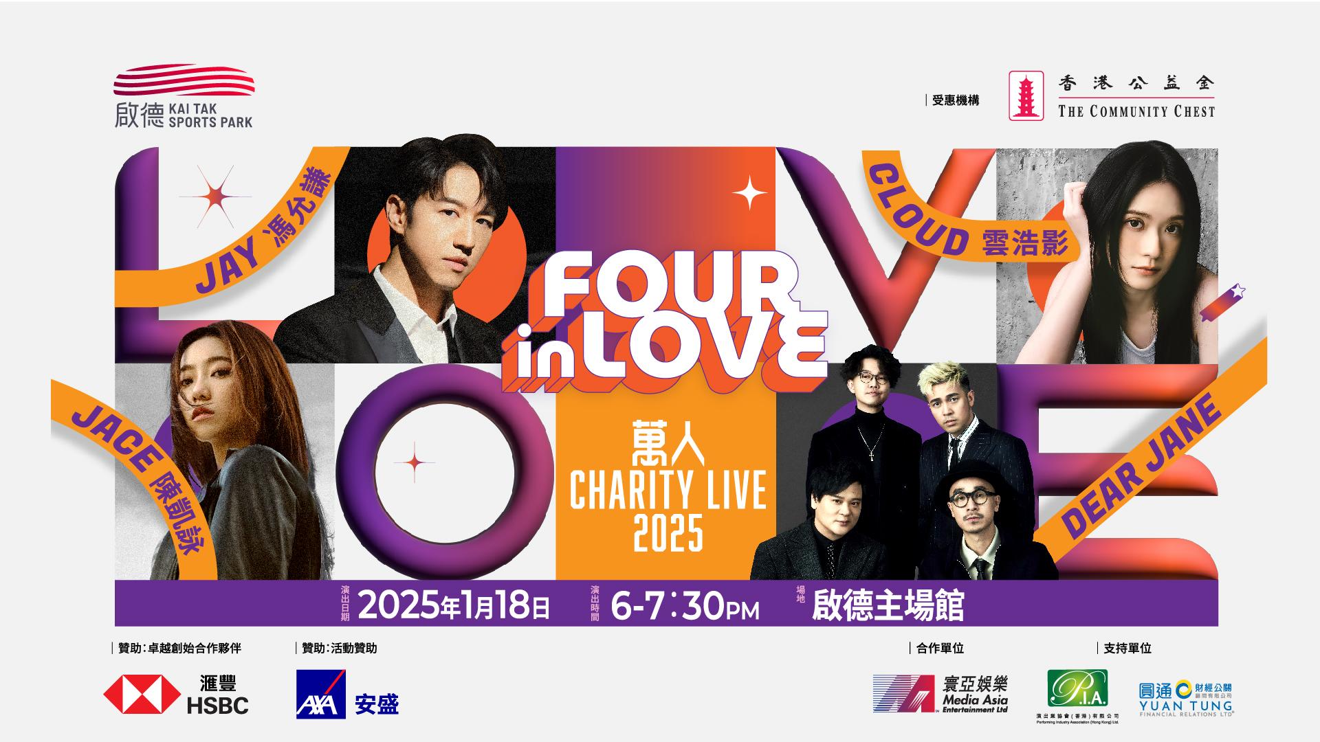 「FOUR in LOVE」屬慈善音樂會,亦是主場館測試活動之一,觀眾可於下午4時開始入場。音樂會由滙豐及AXA安盛贊助,寰亞娛樂提供專業顧問意見,扣除成本支出,全數撥捐香港公益金作慈善用途。汲取上月20日於啟德體育館體藝館舉辦《CHILL เก่ง Music Festival》的音響災難經驗,今次出動憑靚聲和扎實唱功獲封為「音響測試員」的Jay Fung,且看主場館測試能否成功平反。