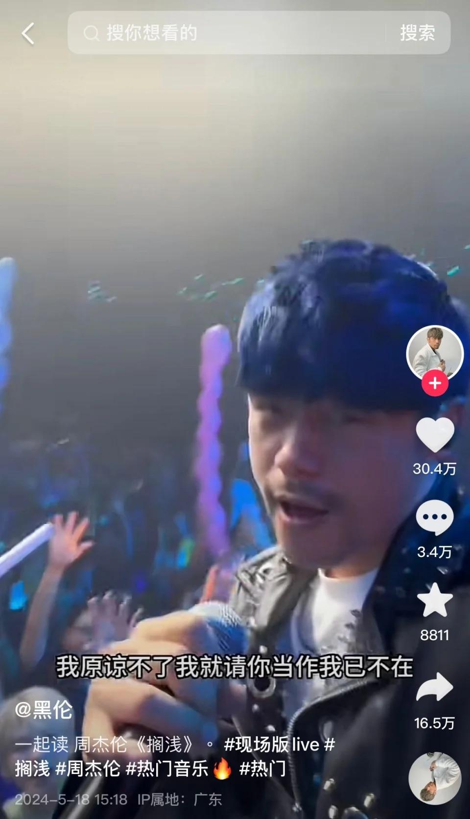 呢位「山寨周杰倫」自稱係歌手「黑倫」,不時喺內地社交平台抖音上載唱歌片段,最近更上載多條「演唱會」嘅短片與網民分享,黑倫有唔少開「演唱會」嘅經驗,喺影片中睇得出佢落力演出,無論造型定係動作都模仿得好似,獲得唔少樂迷支持令全場氣氛高漲。