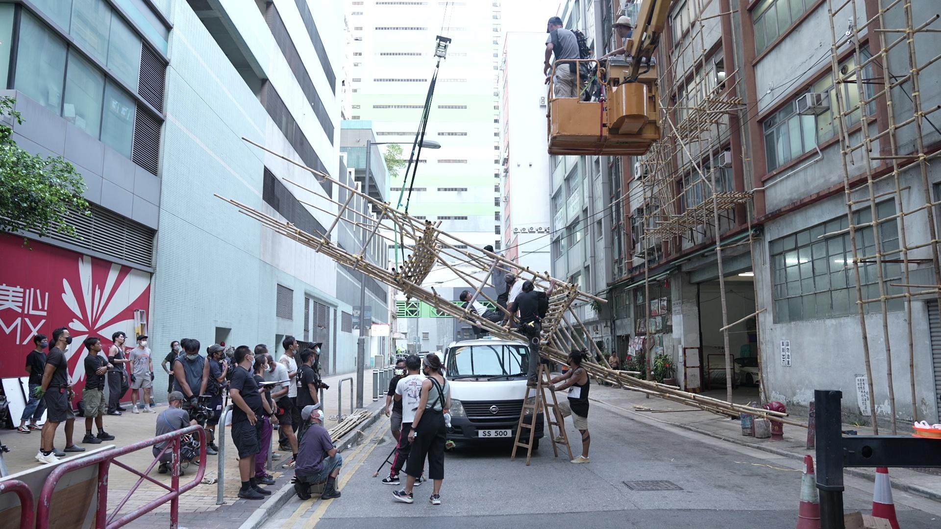 先說大廈倒塌場口,為營造逼真感,除了整個舊樓睡房場景由人手在攝影棚中搭建出來;為增強大廈倒塌時搖晃的震撼感及細緻度,場景中不少衣服及物件均由工作人員以繩索操控,足證每個細節均是花盡心思。而倒塌後遺留在地面的廢墟,更是劇組收集真‧建築廢料,花了足足兩星期模擬搭建而成,拍攝時還請來消防處的坍塌搜救專隊於現場進行指揮,既認真又注重安全。