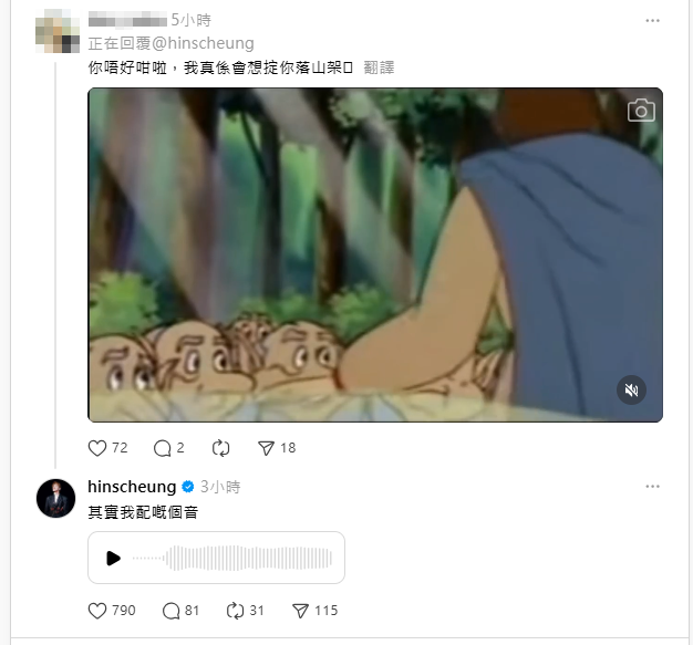 有網民就貼出陳年的惡搞配音《新白雪公主》片段,軒仔索性錄音說出其中一句對白,笑言當年是由他配音。亦有網民列出其他電影海報,指軒仔跟其他外國明星撞樣,他留言說︰「唔好話我唔拍戲呀, 只不過我拍親都係荷李活片咋!」