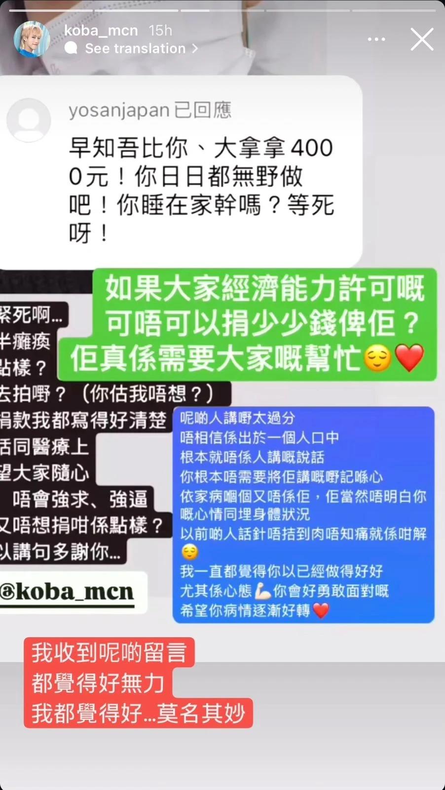 Koba亦有截圖,並喺IG Story出PO反駁:「依家係等緊死啊...擴散咗又半癱瘓,咁你想我點樣?去返工?去拍嘢?(你估我唔想?)招募大家捐款我都寫得好清楚,用喺我生活同醫療上,亦都希望大家隨心。想捐就捐,唔會強求、強逼,咁你捐完又唔想捐咁係點樣?我淨係可以講句多謝你...」