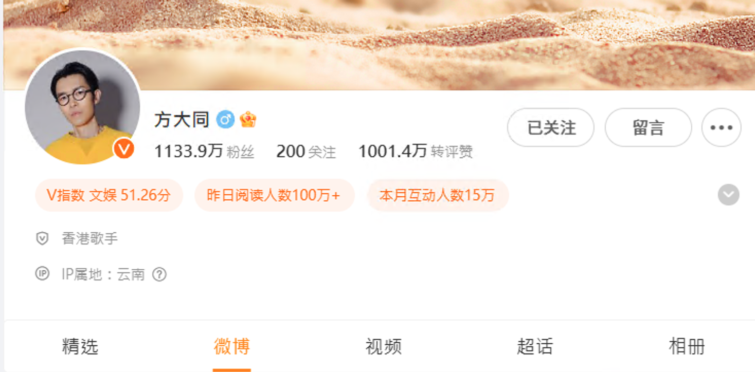 方大同微博顯示他最後上線的日子時,身處雲南。
