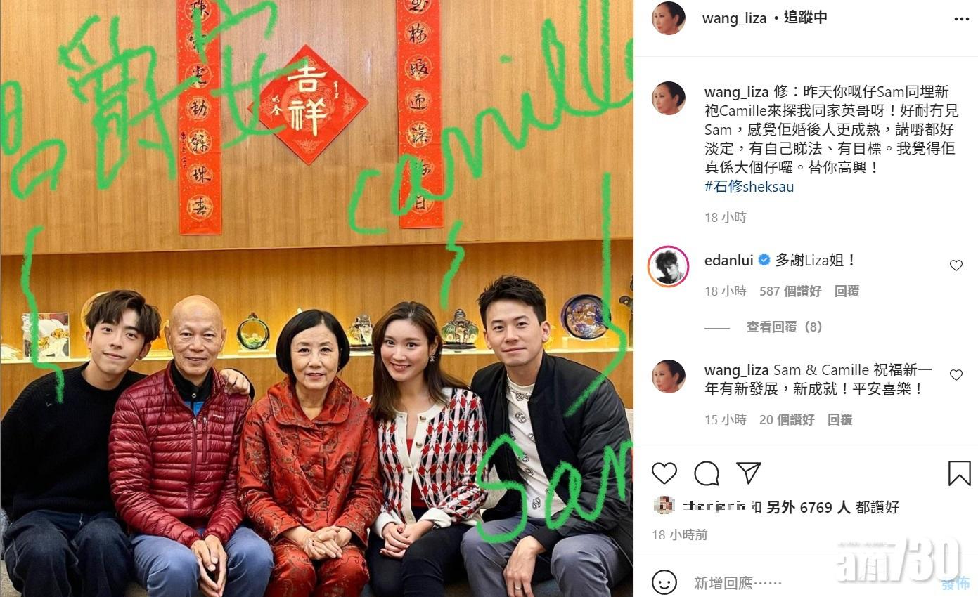 石修亦在阿姐的帖文回應說︰「修:昨天你嘅仔Sam同埋新袍Camille來探我同家英哥呀!好耐冇見Sam,感覺佢婚後人更成熟,講嘢都好淡定,有自己睇法、有目標。我覺得佢真係大個仔囉。替你高興!」