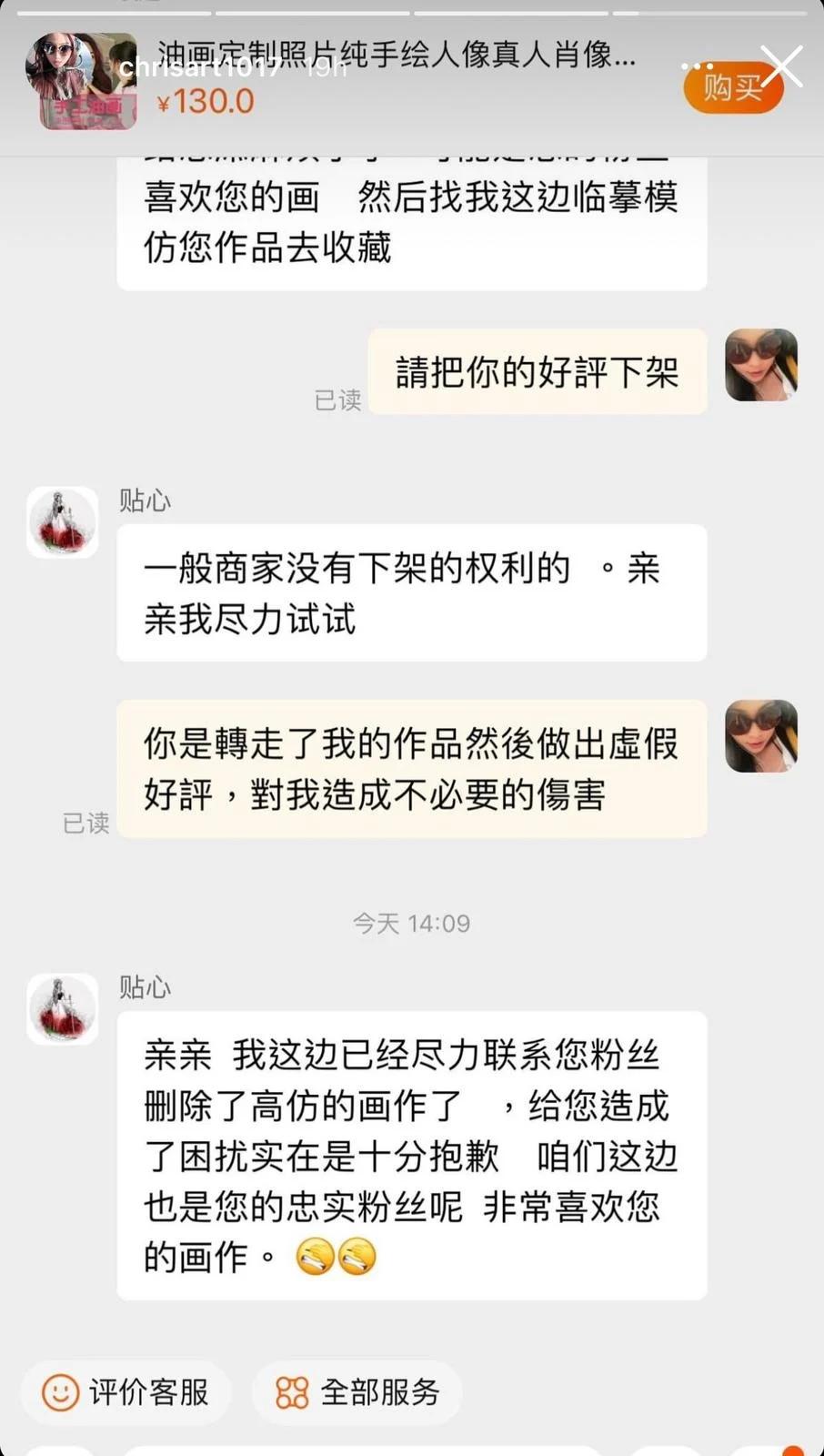 及後,Chris分別上載8月8日與淘寶賣家對話截圖以及三張蓋鳴暉油畫,表示該淘寶賣家偷咗佢作品並於8月26日假扮買家留言好評,指當時係喺TVB化妝間繪畫,所以化妝間內的認證特別多。對話截圖顯示,該淘寶賣家起初表示店舖係來圖訂制,該畫係臨摹香港一個畫家嘅作品,當Chris向其指出係畫作原作人及感到傷害後先成功令淘寶賣家跪低道歉。
