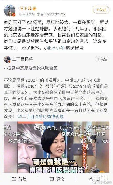汪小菲於今日凌晨在微博轉發「小S親中態度及言論視頻合集」,留言說︰「認識她們十幾年了,和我回到北京去山東老家看親戚,日常我們在家裡的對話,她們真的是最期望兩岸和平認祖歸宗的外省人,這麼多年做了、說了很多」,不過汪小菲似乎幫倒忙,不但引來大陸網民留言鬧爆,就連台灣網民亦都不賣帳。
