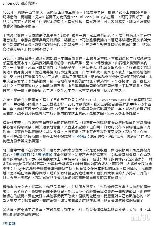 伍家謙在IG大談過去歷年關於奧運的經歷。