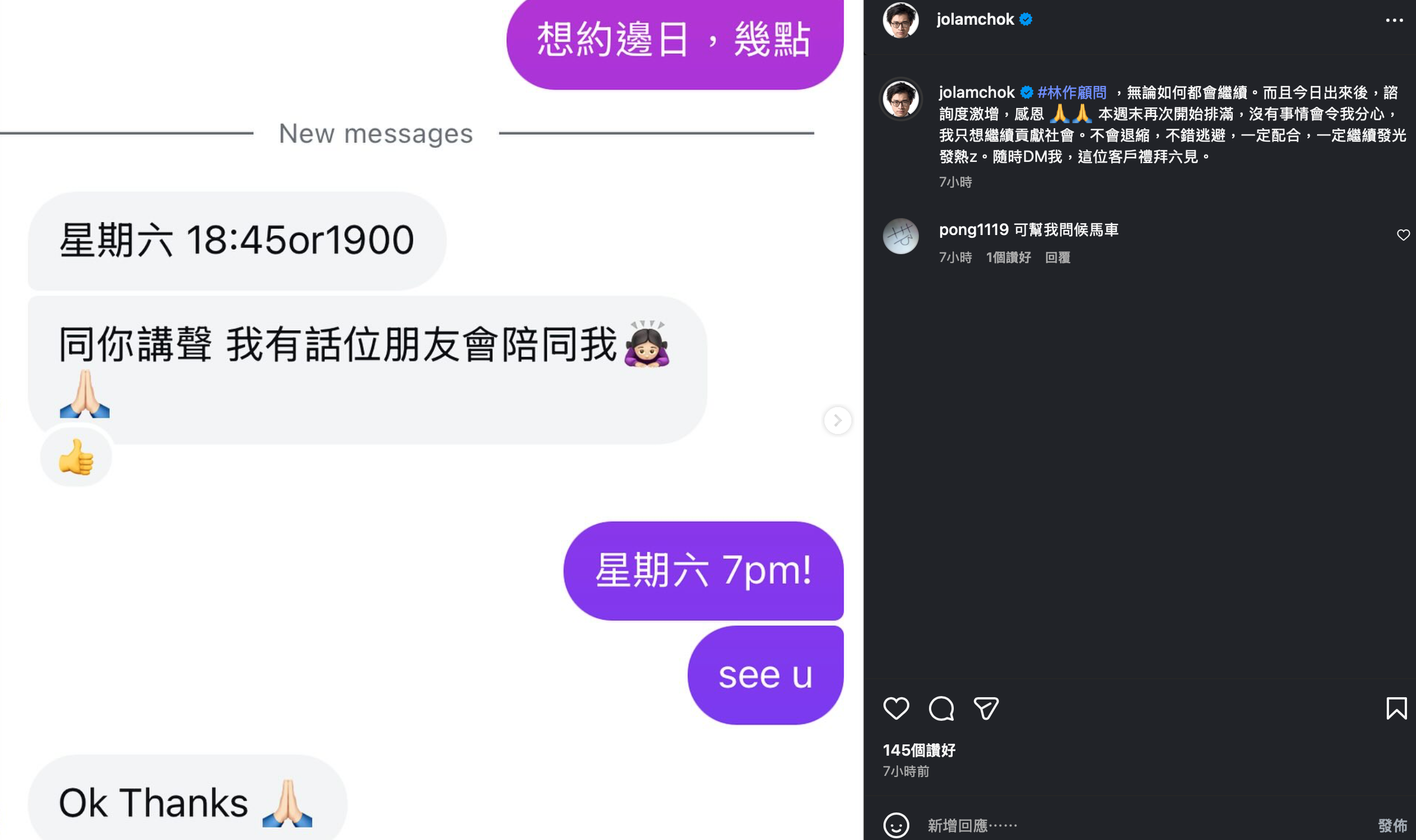 不過,如裕美所言,林作非常著緊他的客戶需要,隨即分享多張跟客戶的對話截圖,留言說:「謝謝你們的體諒,我已經全面復工」、「6:30pm,離開裁判法院後兩小時,完成第一位 #林作顧問 客戶。生意照常,客戶繼續急不可待找我諮詢。這就是我的實力。」