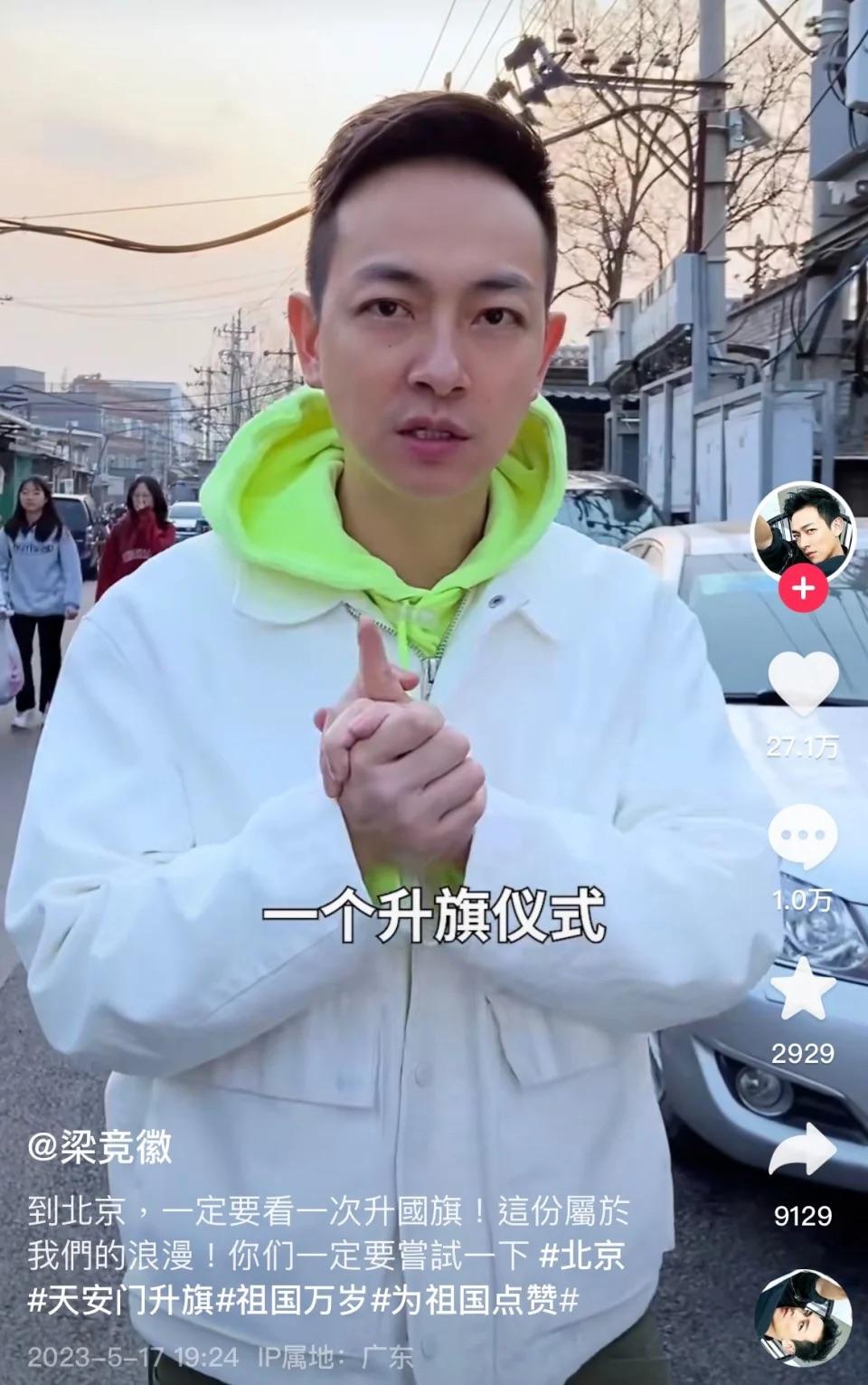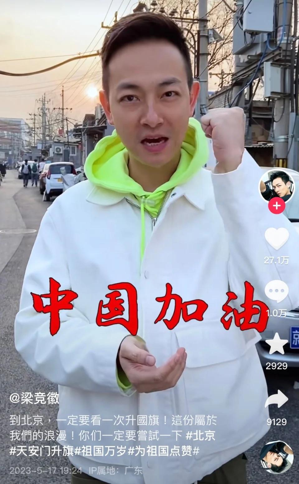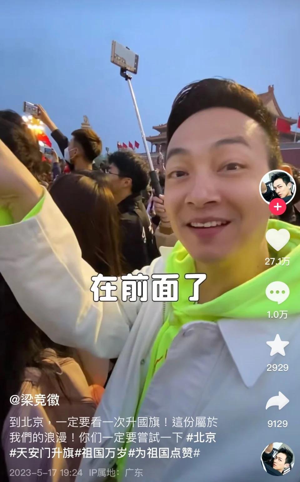 梁競徽(前名梁烈唯)近年專注內地發展,不時於內地社交平台分享日常生活及帶貨搵真銀。曾經試過直播賣海鮮,吸引逾100萬人觀看,銷售額衝破50萬,早前又大曬新入手逾70萬Rolex名錶,似乎撈得風生水起。最近,梁競徽就去咗一趟北京旅行,一圓到天安門睇升旗禮及登上萬里長城嘅心願;佢仲喺長城上高唱《精忠報國》,非常激動。