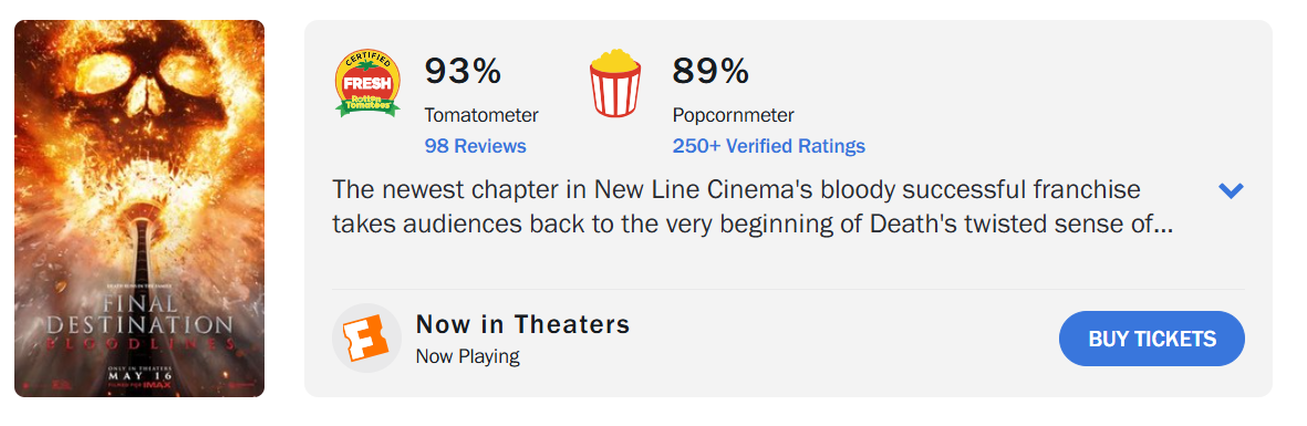 《死神來了:血脈》在「爛番茄」上開出93%好評,贏得影迷們一致正面評價。