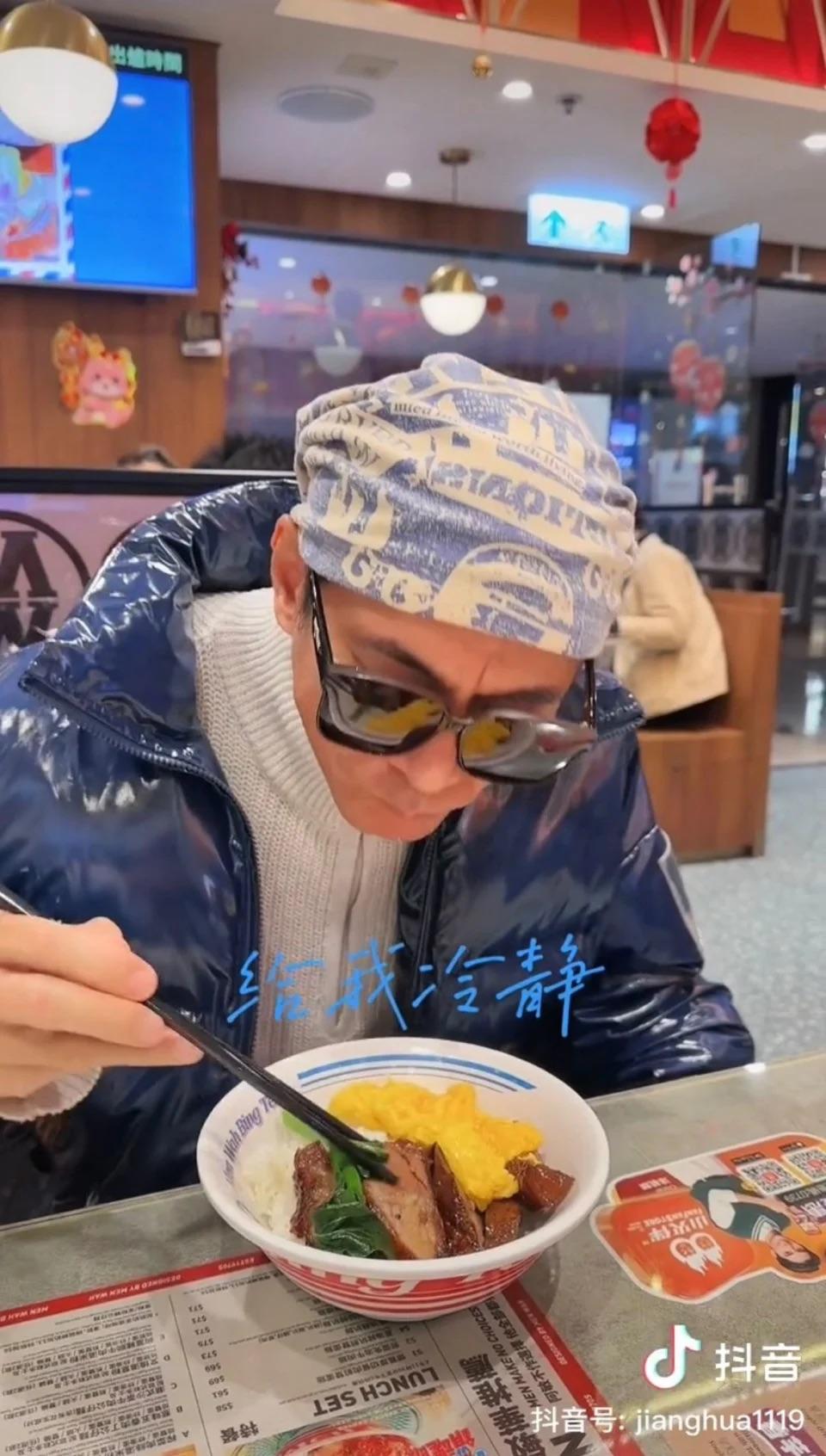 最近江華拍片並上載到抖音同網民分享,片中嘅佢喺茶餐廳食緊叉燒飯,不過佢就依然戴住頭巾同黑超。