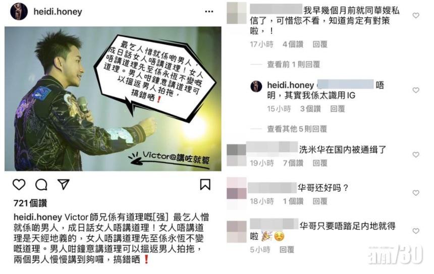 這則帖文引來不少網民留言問到洗米華的情況,其中有人指早幾個月便私信Heidi,稱「可惜您不看,知道肯定有對策啦」而Heidi就回覆說︰「不懂,其實我不太會用IG」似乎未知洗米華出事。不過,這則帖文已於今日刪除,未知是否避免其他人胡亂猜測他們的夫妻關係。