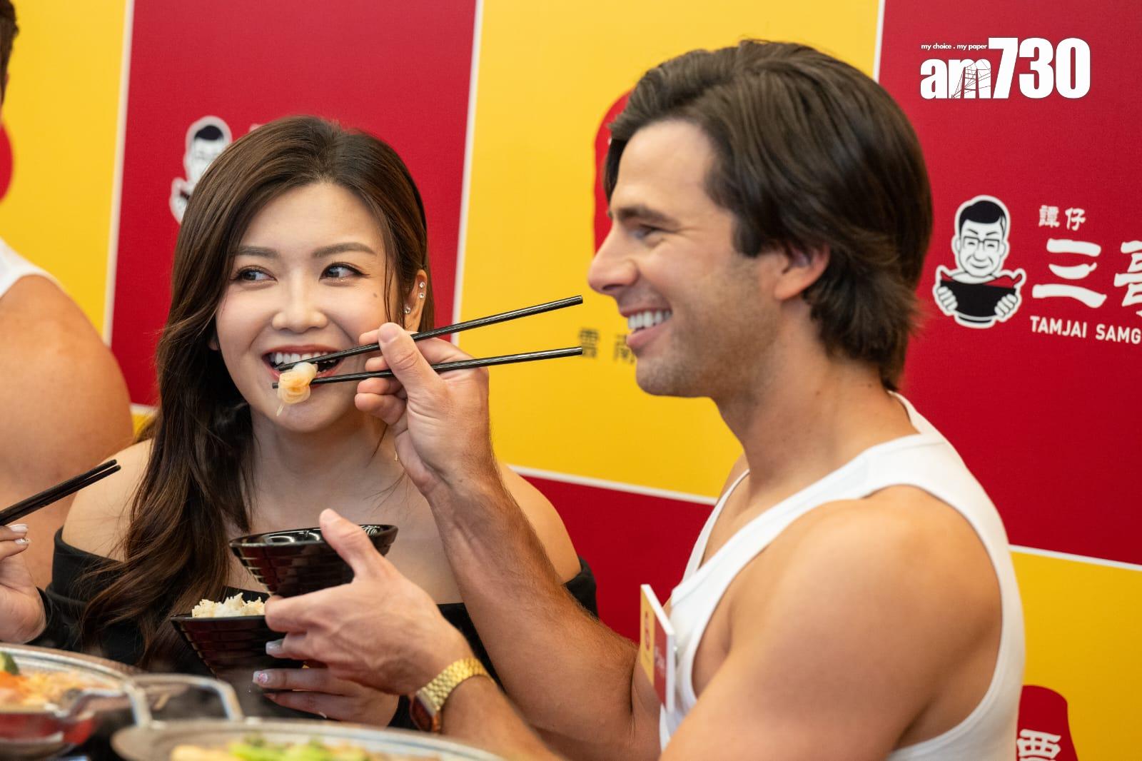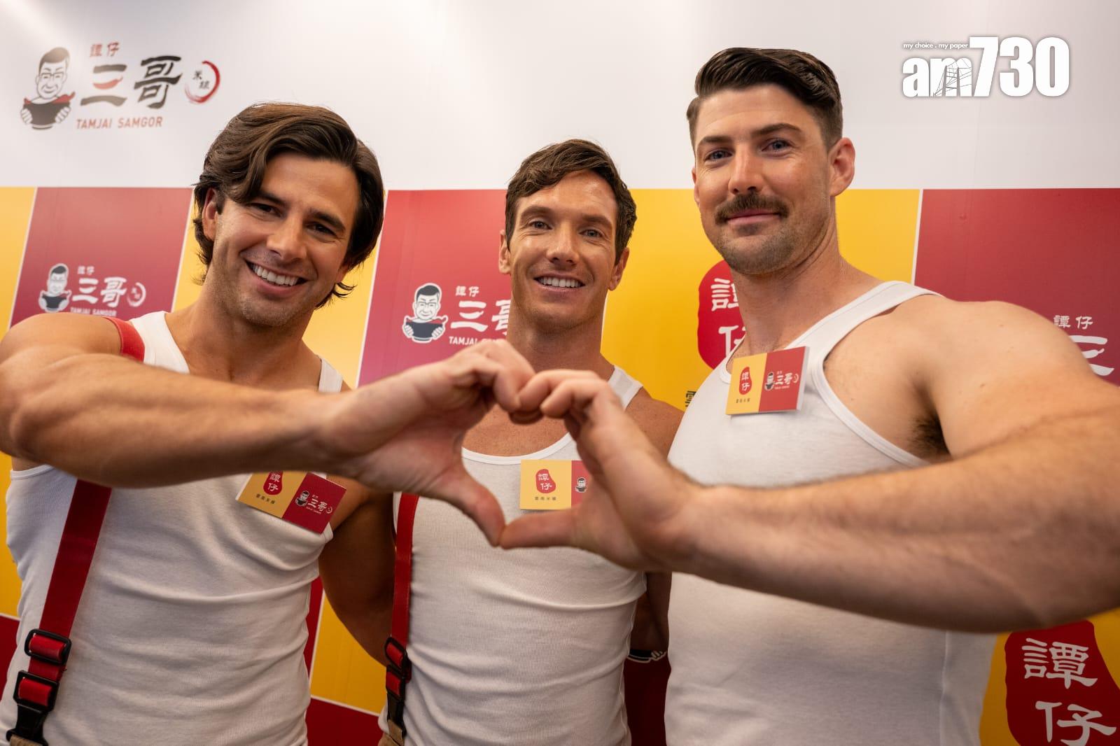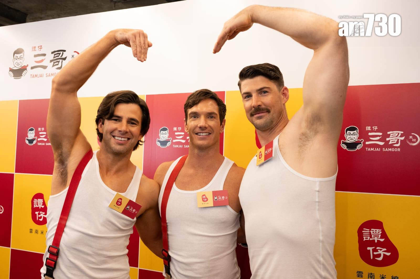 三位Hot爆的2024澳洲消防員月曆封面猛男Brenden Purvis、Michael Galanos及Ricky Smith,日抵港正式展開三天行程,今日與頭楊詩敏及練美娟一同出席譚仔雲南米線及譚仔三哥米線全新「熱鍋」系列發布會。