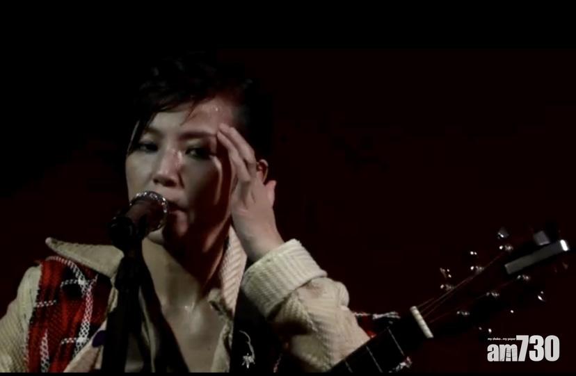 在沒有冷氣的場地開騷,何韻詩只唱了幾首歌,已大汗淋漓。(直播截圖)