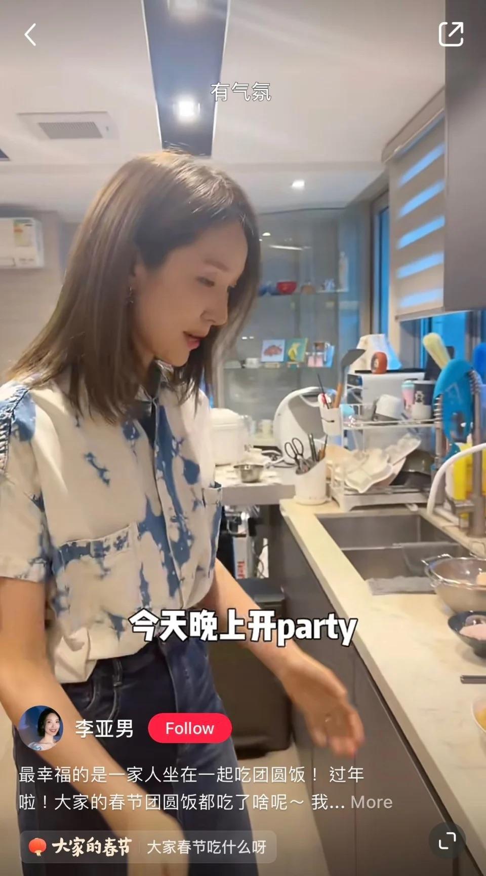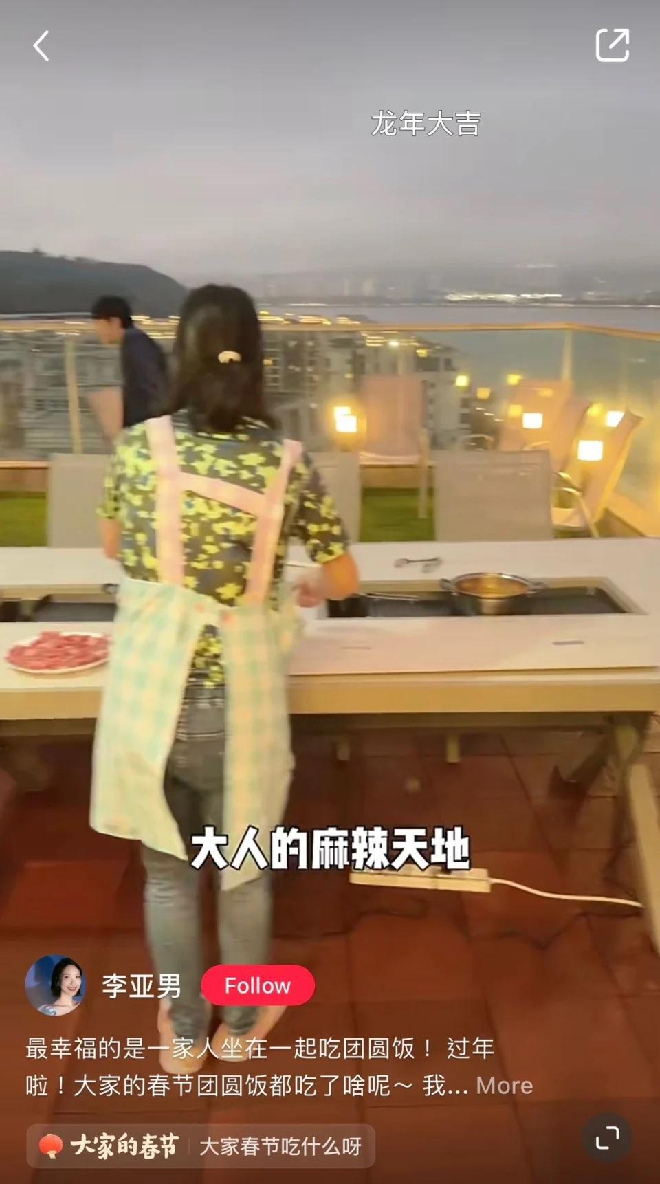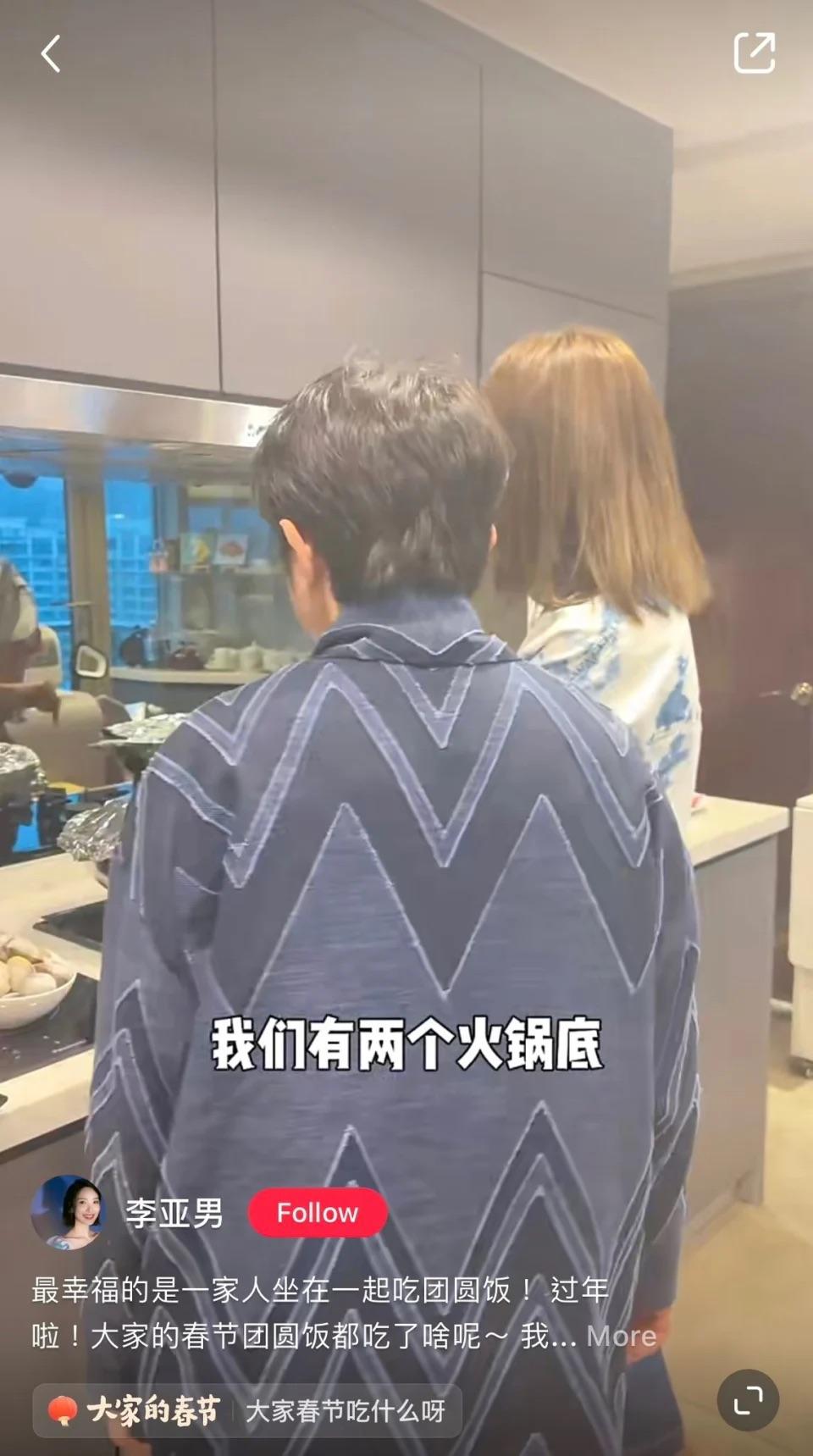 李亞男喺小紅書上載影片並留言:「最幸福的是一家人坐在一起吃團圓飯!過年啦!大家的春節團圓飯都吃了啥呢~我們家晚上要開party,為了滿足所有人的口味,這次的團圓飯東南西北各種口味都安排上了~新的一年要繼續多陪伴家人,珍惜和家人團圓的時光!#很男不有趣的日常 #浪漫生活的記錄者 #大家的春節 #我家年味不一般 #明星不止AB面」。
