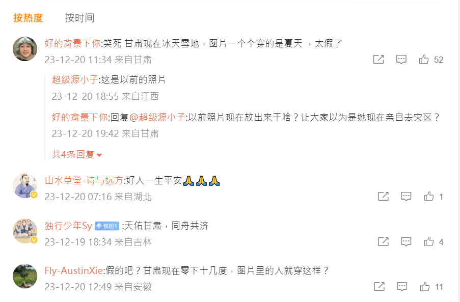 由於甘肅當地非常寒冷,韓紅等人都穿得非常厚,相反彭丹的照片就顯得非常清涼,同時很多網民留言指彭丹用十多年前的照片,質疑她有抽水之嫌。網民留言說︰「笑死,甘肅現在冰天雪地,圖片一個個穿的是夏天,太假了」、「作秀博取眼球,太噁心了」、「故意誤導」、「我覺得你還是標上『圖片與實際無關』,你可能不知道災區現在的天氣情況吧。」
