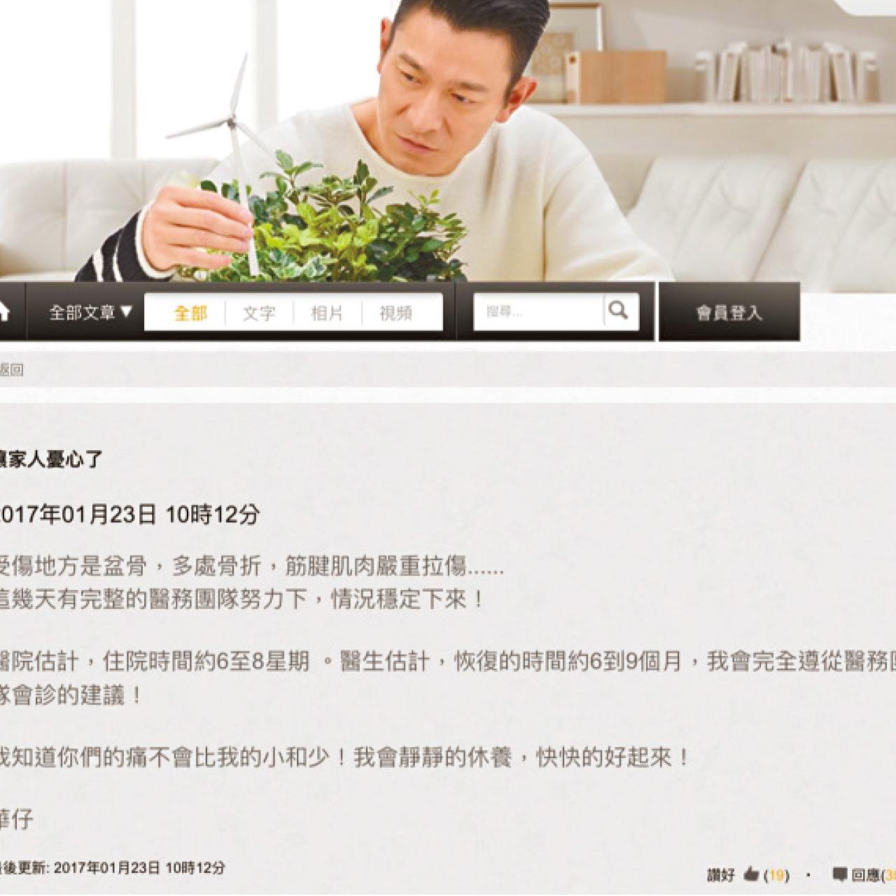 華仔在官網表示:「受傷地方是盆骨,多處骨折,筋腱肌肉嚴重拉傷……這幾天有完整的醫務團隊努力下,情況穩定下來!醫院估計,住院時間約6至8星期。醫生估計,恢復的時間約6到9個月,我會完全遵從醫務團隊會診的建議!我知道你們的痛不會比我的小和少!我會靜靜的休養,快快的好起來!」