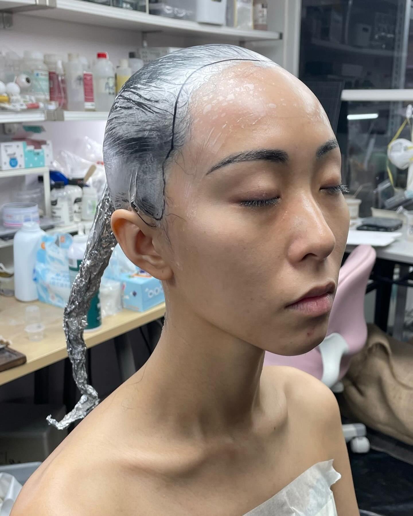 另一堆照片就見到Katrina為了製作皮囊,需要倒模,相中見到她被厚厚的物料覆蓋住,隔住照片也感覺到她呼吸有困難,而製作出來的效果更難分真假。