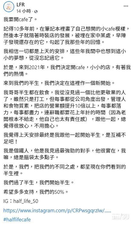 練美施在網上宣布與哥哥開cafe。