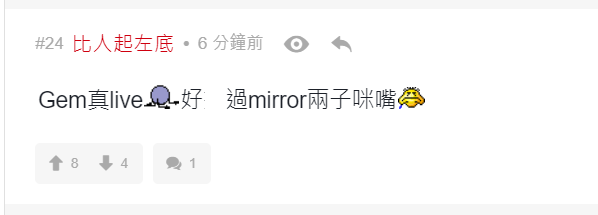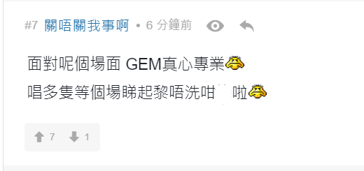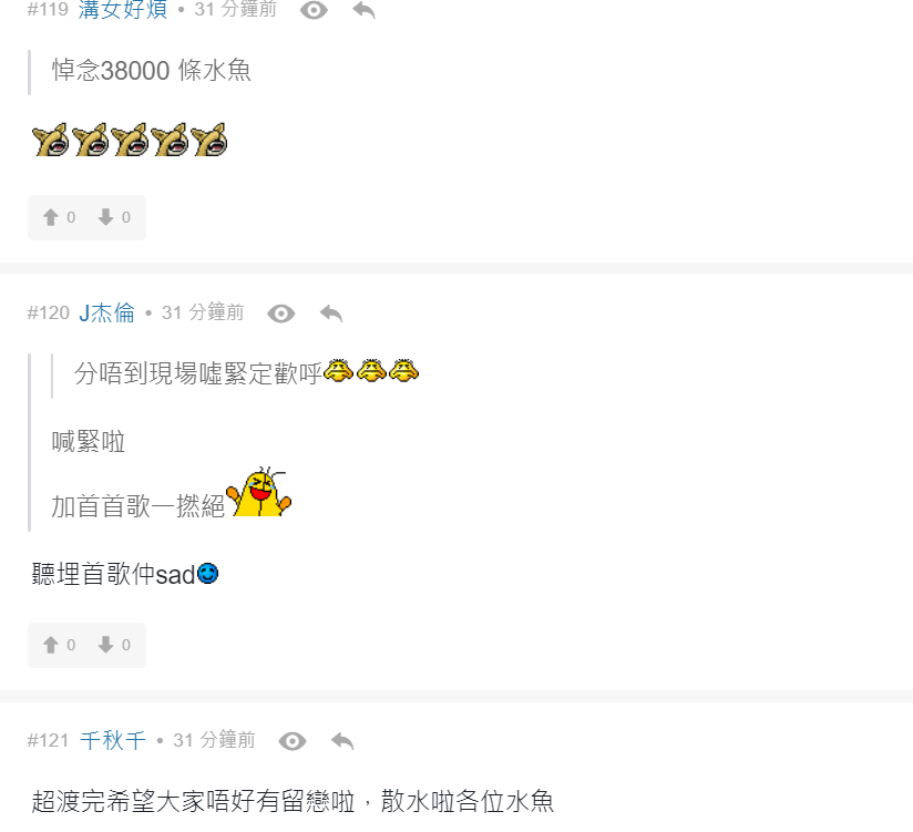 有網民留言說︰「阿gem係咪諗住用自己歌聲完結呢場戰爭」、「4000$只可以說服自己睇GEM」、「牙gem 追悼水魚」、「變咗大型追悼會」、「全日最精彩環節」、「散哂場先黎表演, 仲要唱amazing grace, 邊X個諗出黎」、「悼念全場走晒」、「悼念38000 條水魚」、「無可否認GEM比開場前既表演水準高好多」。