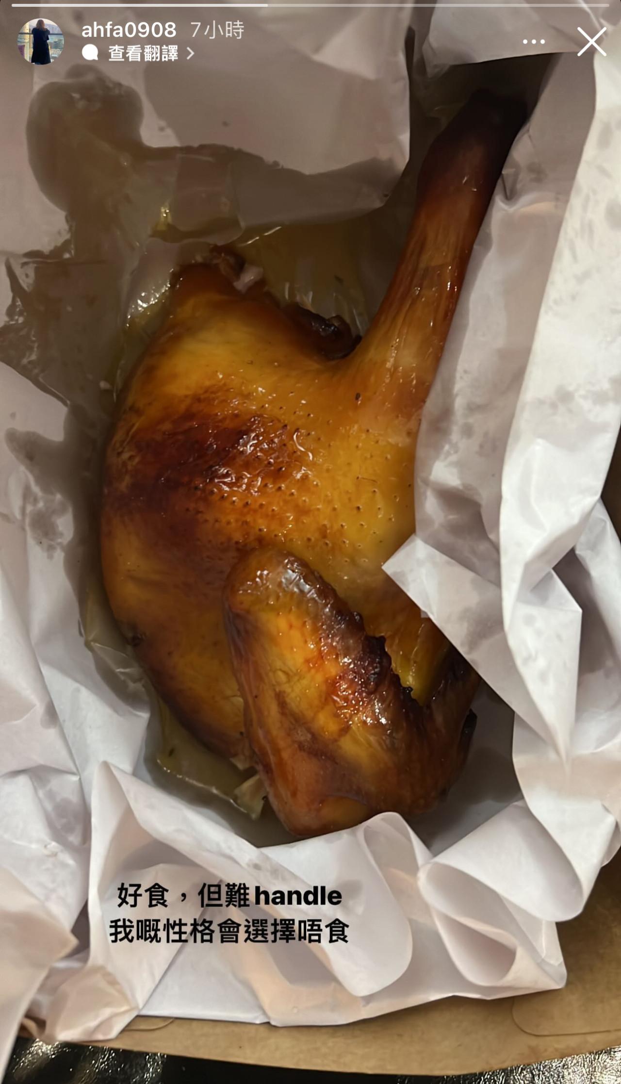 與此同時,花姐(黃慧君)昨日在IG限時動態連出兩張圖,一張影住食片皮鴨的餅皮,另一張則一隻燒雞的照片。她在餅皮的照片打上「食飯背後……」,而燒雞的照片就寫了「好食,但難handle,我嘅性格會選擇唔食。」令不少人聯想到花姐借圖表達自己對Frankie今次事件的看法。
