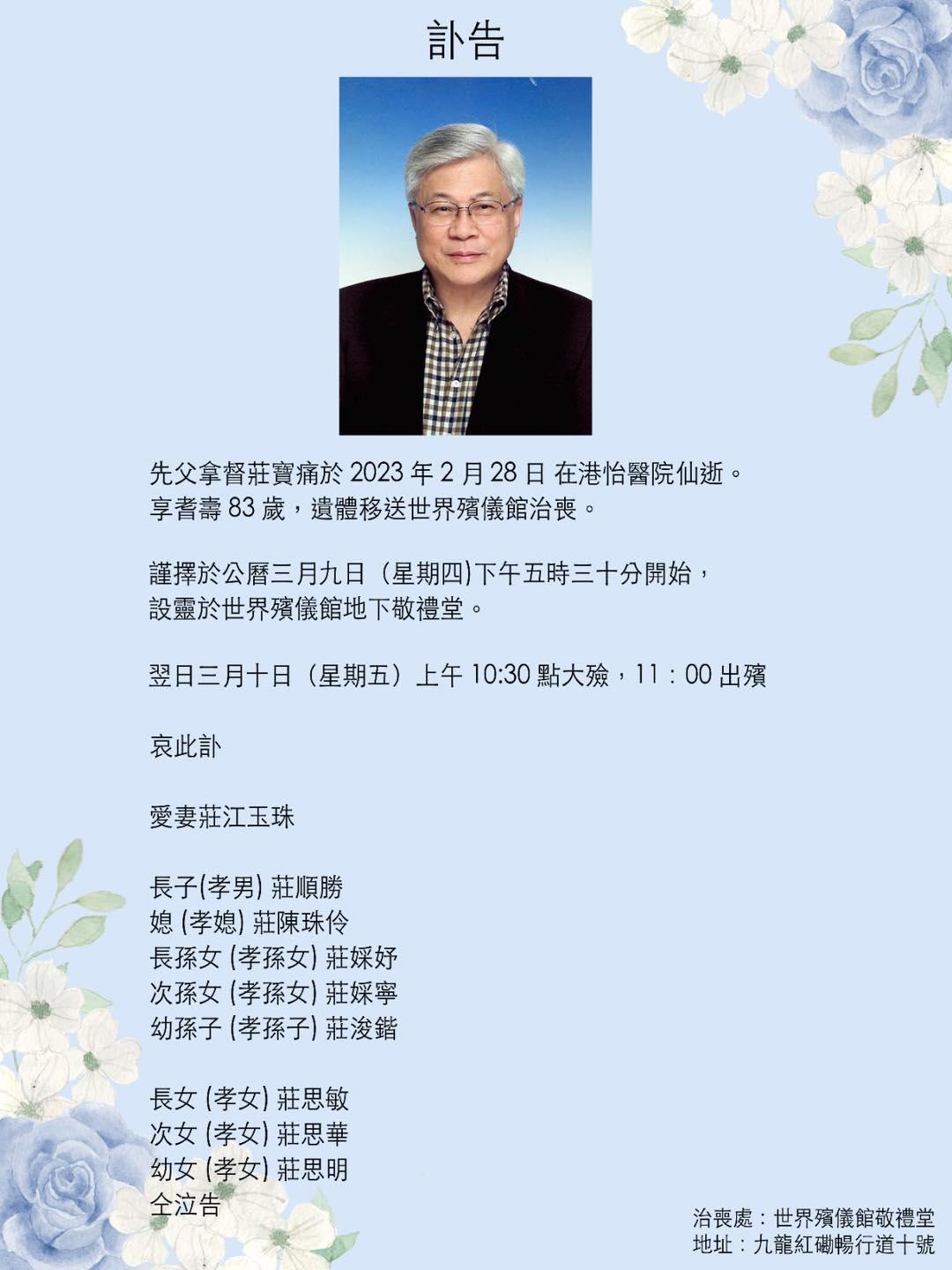今日莊氏姊妹在網上貼出訃聞,見到莊鍶敏用回原名莊思敏。莊父的喪禮於3月9日在世界殯儀館設靈,翌日大殮和出殯。早前莊思明的二嫂在社交平台上載家人視像通話的短片,眾人都哭至雙眼通紅,但仍對鏡頭強顏歡笑,片中楊明更是哭到眼都腫起來,可見他已一早視莊父為至親。
