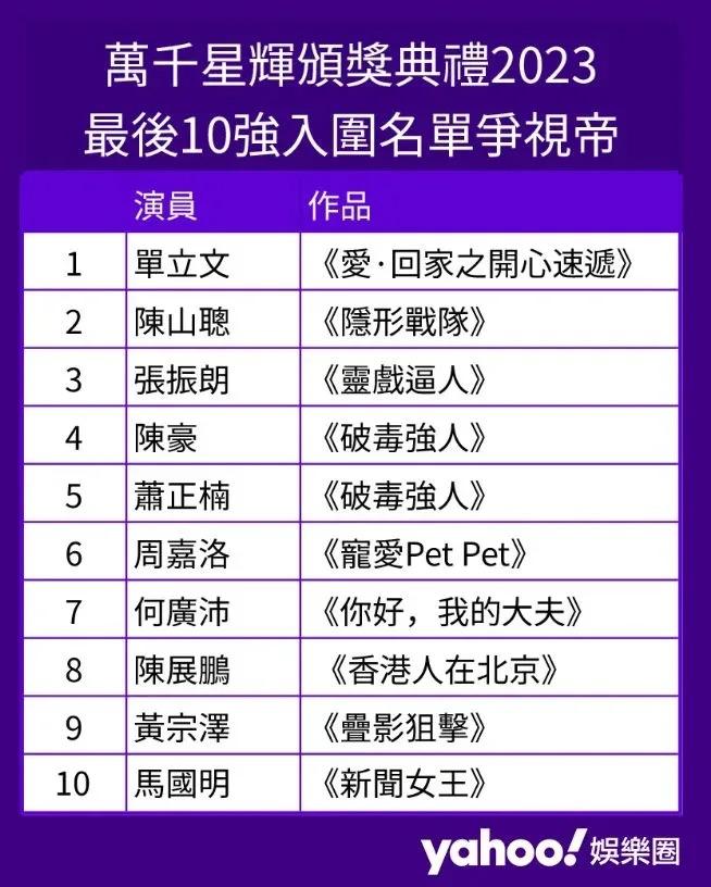 「Yahoo 民調」在 12 月 21 日起設立問題,截至 27 日錄得 14,216 名用戶投票表達意向。視帝方面,結果顯示《破毒強人》陳豪及《新聞女王》馬國明分別以 26.7%(3,801人)及 25.3%(3,598人)拋離其他入圍者,第三位就係《愛·回家之開心速遞》單立文的 11.9%(1,704人),似乎用戶心目中陳豪及馬國明屬今屆視帝大熱,而幾位新生代小生仍有待努力,唔知馬明有冇機會拉埋天窗後再奪視帝雙囍臨門呢?