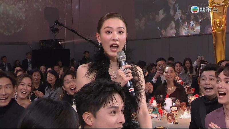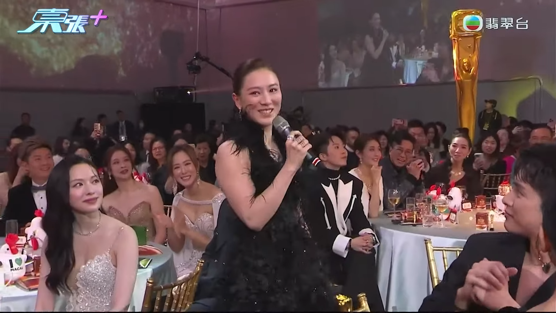 她舉起獎項向住曾志偉的方向說:「嘩!嘩!我攞獎呀!老爺!」而且笑得非常開心,她續說︰「呢個唔係Live?唔係電視㗎嘛?」在場人士答︰「係呀!」令她立即擘大個口得個窿,塊面亦開始紅卜卜,她尷尬表示「吓?多謝」之後對住鏡頭傻笑。