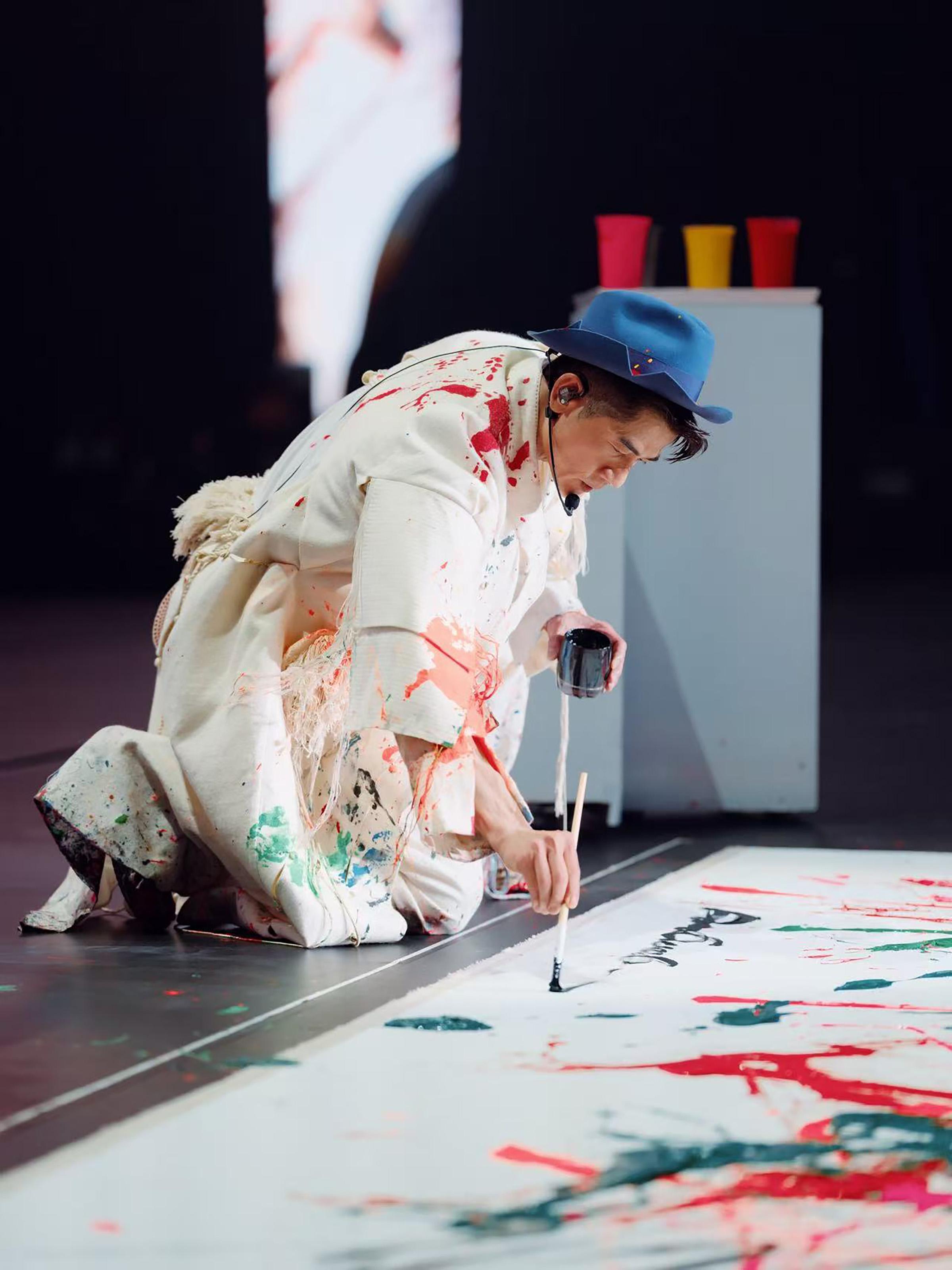 城城今次演唱會繼續延續台上作畫的概念,他邊唱邊跳《分享愛》,邊潑顏料作畫